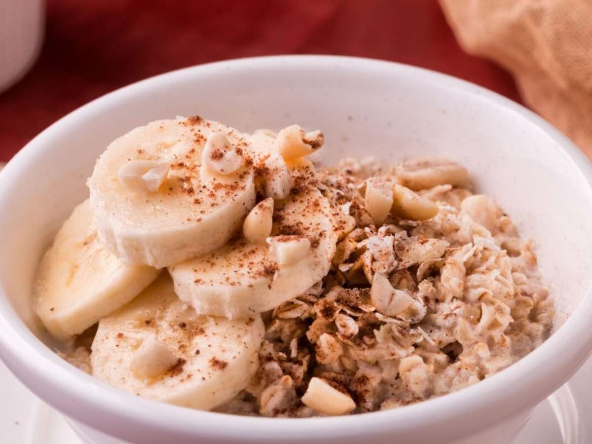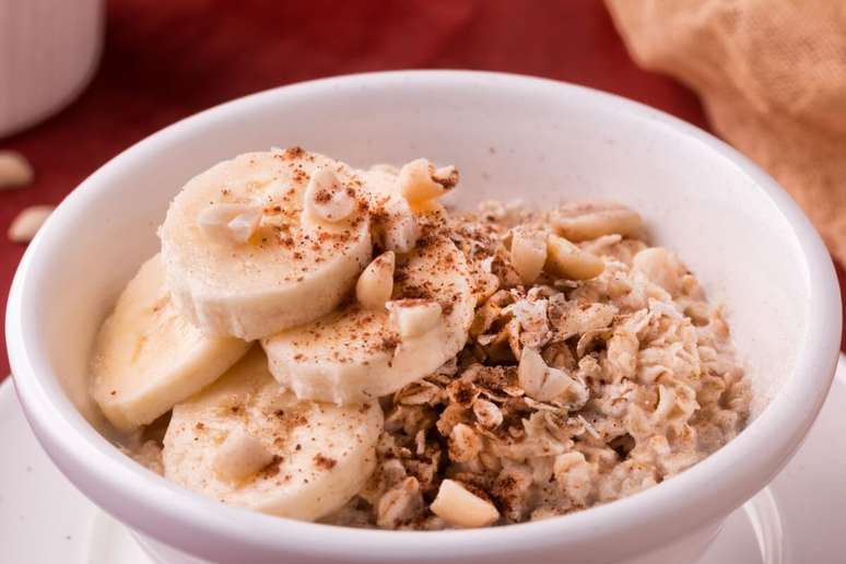 Em uma panela, coloque o leite e a aveia. Leve ao fogo médio e mexa até começar a engrossar. Adicione a banana amassada e continue mexendo até obter uma textura cremosa. Retire do fogo e misture o amendoim até incorporar. Acrescente o mel e misture bem. Polvilhe canela e finalize com rodelas de banana e amendoim por cima. Sirva em seguida.