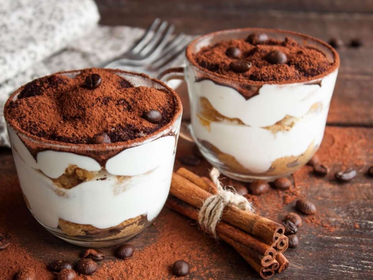 Depois, umedeça os biscoitos em uma tigela com café rapidamente, sem deixar encharcar. Em taças individuais, monte o tiramisù: comece com uma camada fina de creme, adicione pedaços dos biscoitos umedecidos, cubra com mais creme. Repita o processo até completar duas ou três camadas. Finalize polvilhando cacau em pó por cima com auxílio de uma peneira. Leve à geladeira por pelo menos 2 horas antes de servir. Decore com grãos de café.