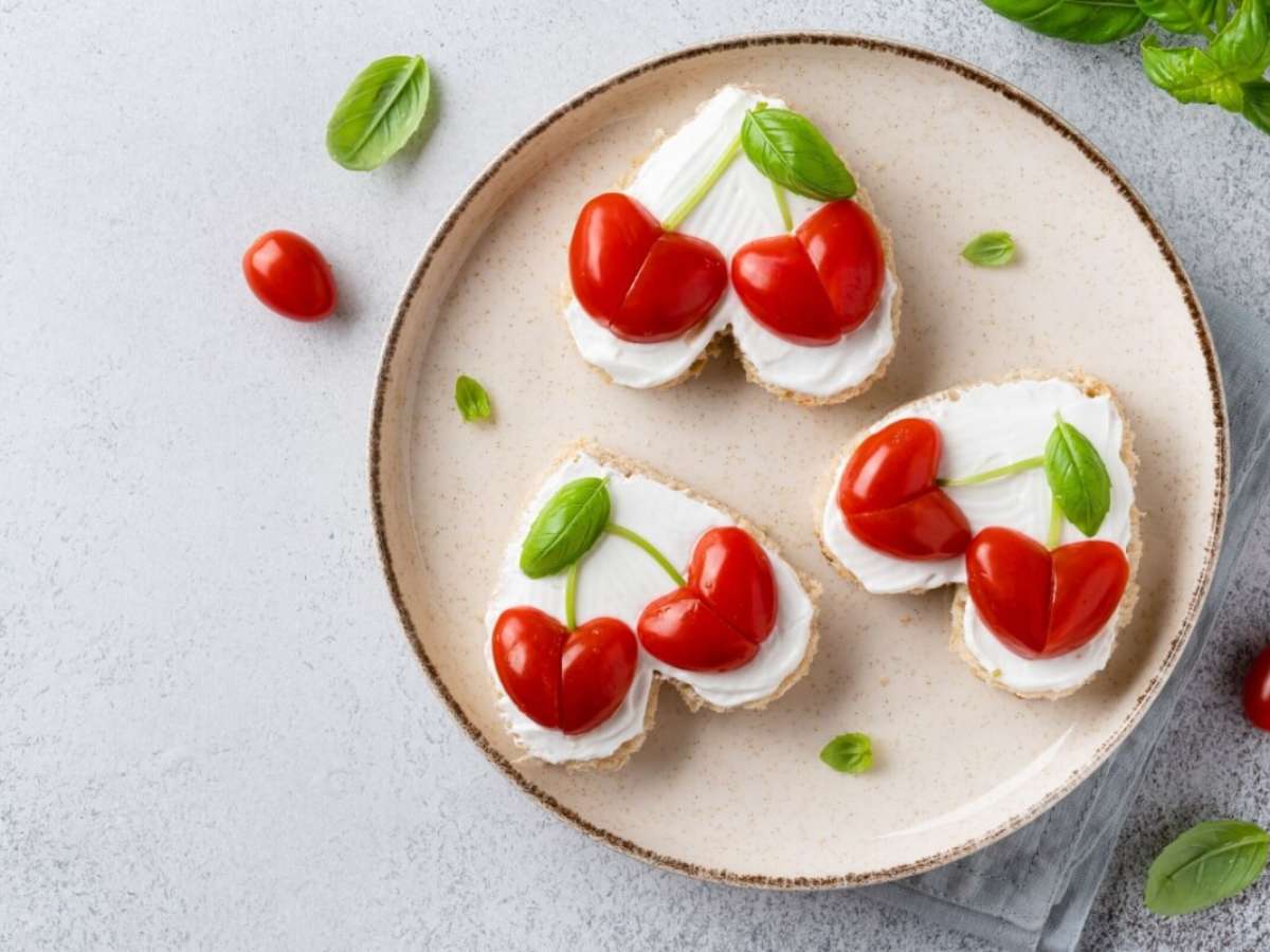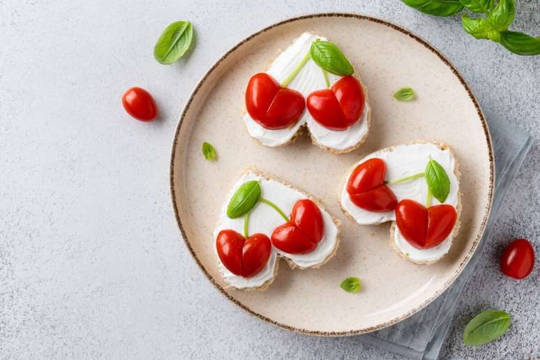 Espalhe o cream cheese sobre as fatias de pão tostadas. Arrume os tomates cortados sobre o cream cheese de forma que fiquem parecendo corações. Adicione um pequeno talo de manjericão para imitar a haste das cerejas. Finalize com uma pitada de sal e pimenta-do-reino.