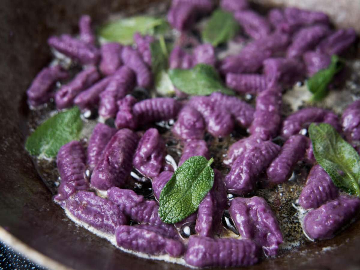Em uma frigideira, aqueça o azeite de oliva em fogo médio. Adicione as folhas de sálvia e deixe-as dourar levemente no azeite. Tempere com sal e pimenta-do-reino. Misture os nhoques cozidos no molho de sálvia. Sirva em seguida.