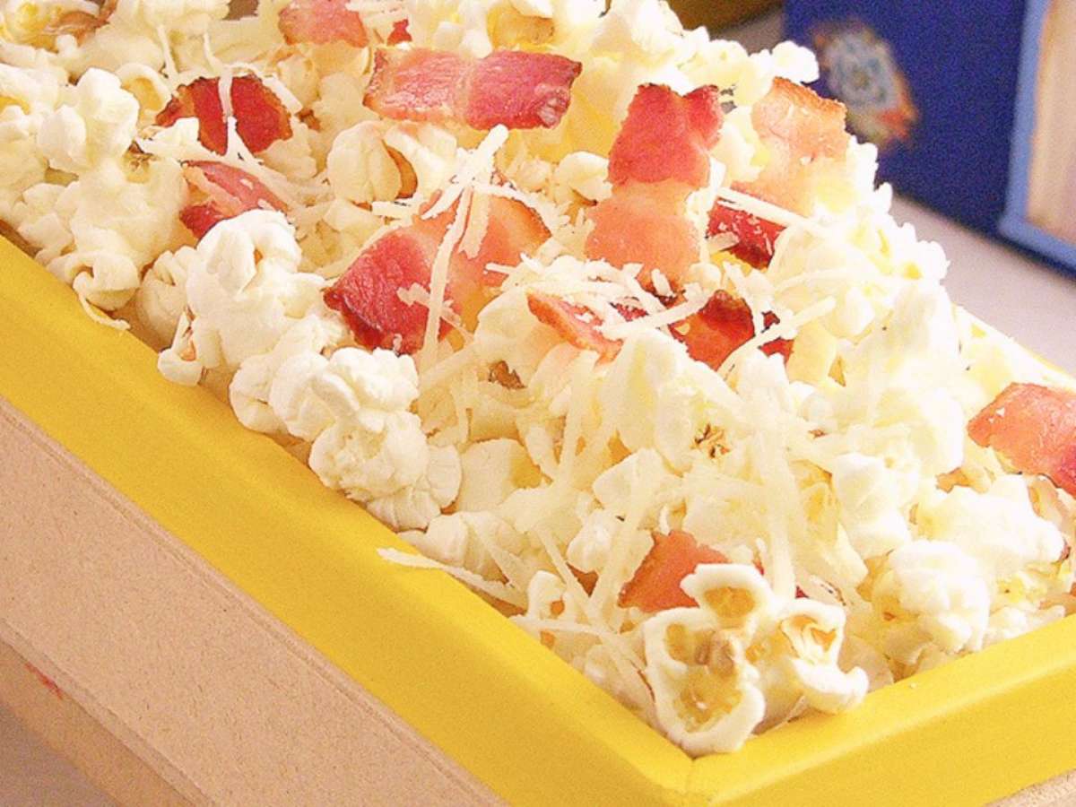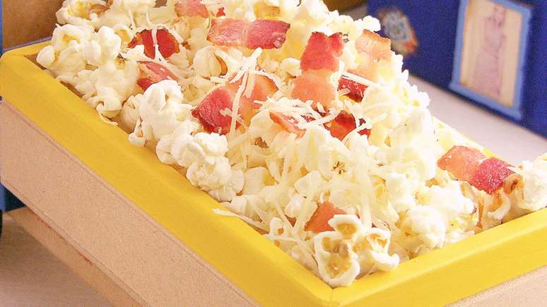- Despeje a pipoca numa tigela e misture com o bacon e a linguiça.