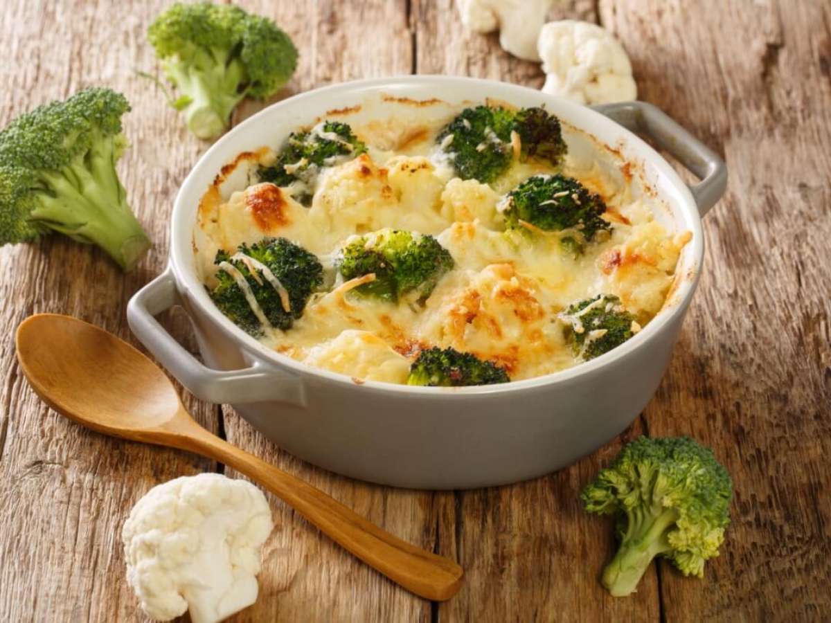 Em uma panela, coloque a água e leve ao fogo médio para ferver. Adicione uma pitada de sal e cozinhe o brócolis e a couve-flor por 3 minutos. Escorra e reserve. Em uma panela, derreta a manteiga em fogo baixo e adicione a farinha de trigo, mexendo bem para formar uma pastinha dourada. Aos poucos, acrescente o leite, mexendo constantemente para não empelotar. Tempere com sal, noz-moscada e pimenta-do-reino. Cozinhe até engrossar. Em um refratário, distribua o brócolis e a couve-flor e despeje o molho branco por cima. Polvilhe a muçarela e o queijo parmesão ralado. Leve ao forno preaquecido a 200 °C por cerca de 15 minutos. Sirva em seguida.