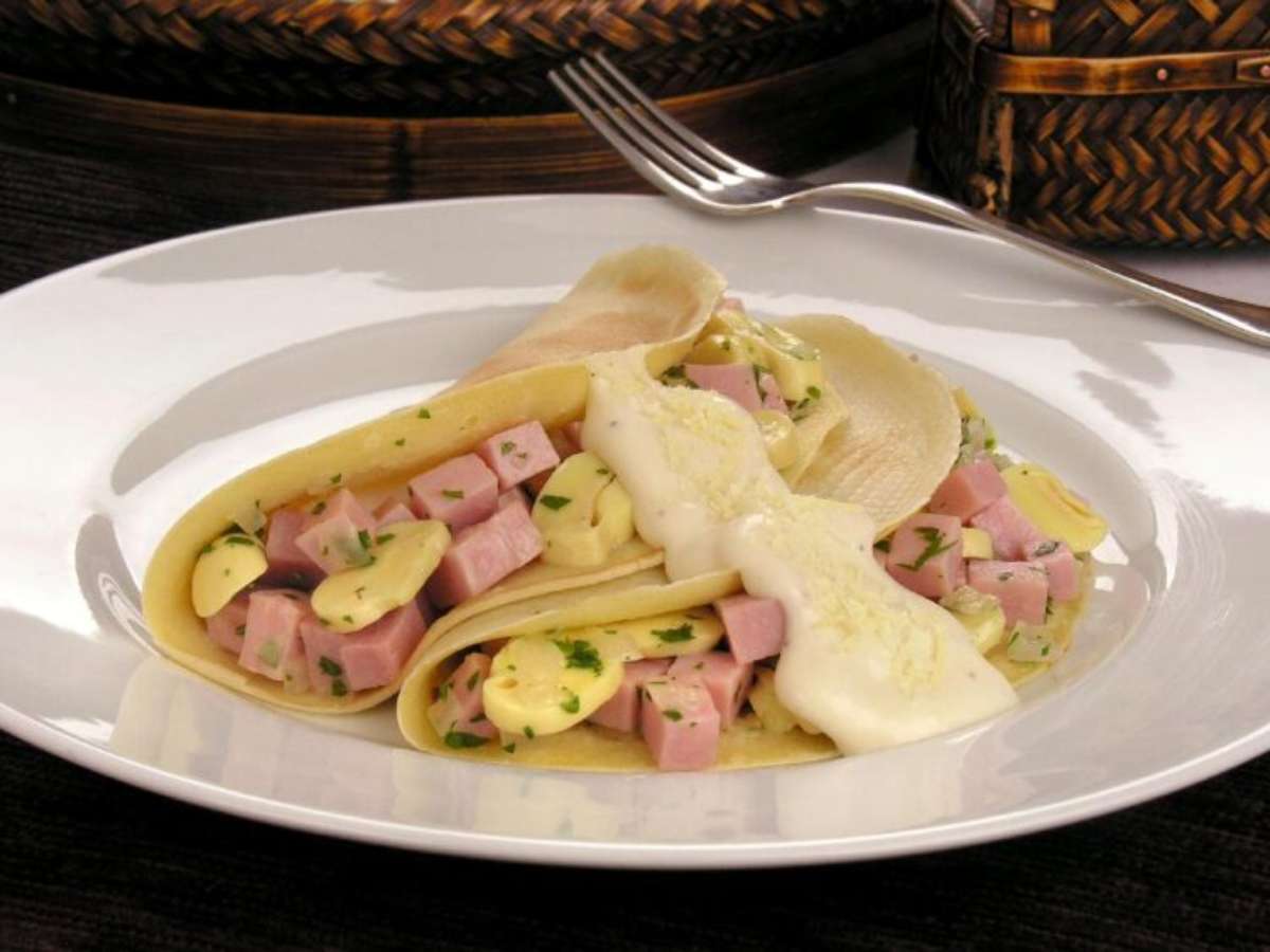 Panqueca de cogumelo com presunto e molho bechamel