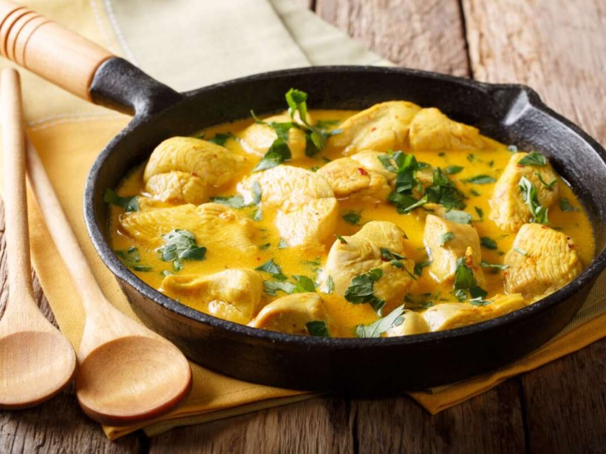 Em uma frigideira grande, aqueça o azeite em fogo médio e adicione a cebola. Refogue até ficar transparente. Acrescente o alho e mexa por mais 1 minuto. Adicione os cubos de frango e doure levemente de todos os lados. Tempere com a cúrcuma, a páprica doce, o sal e a pimenta-do-reino, misturando bem para envolver o frango nos temperos. Despeje o leite de coco e o caldo de frango. Misture bem e deixe cozinhar em fogo baixo por cerca de 10 a 15 minutos, até o molho engrossar e o frango ficar macio. Finalize com a salsinha e sirva em seguida.