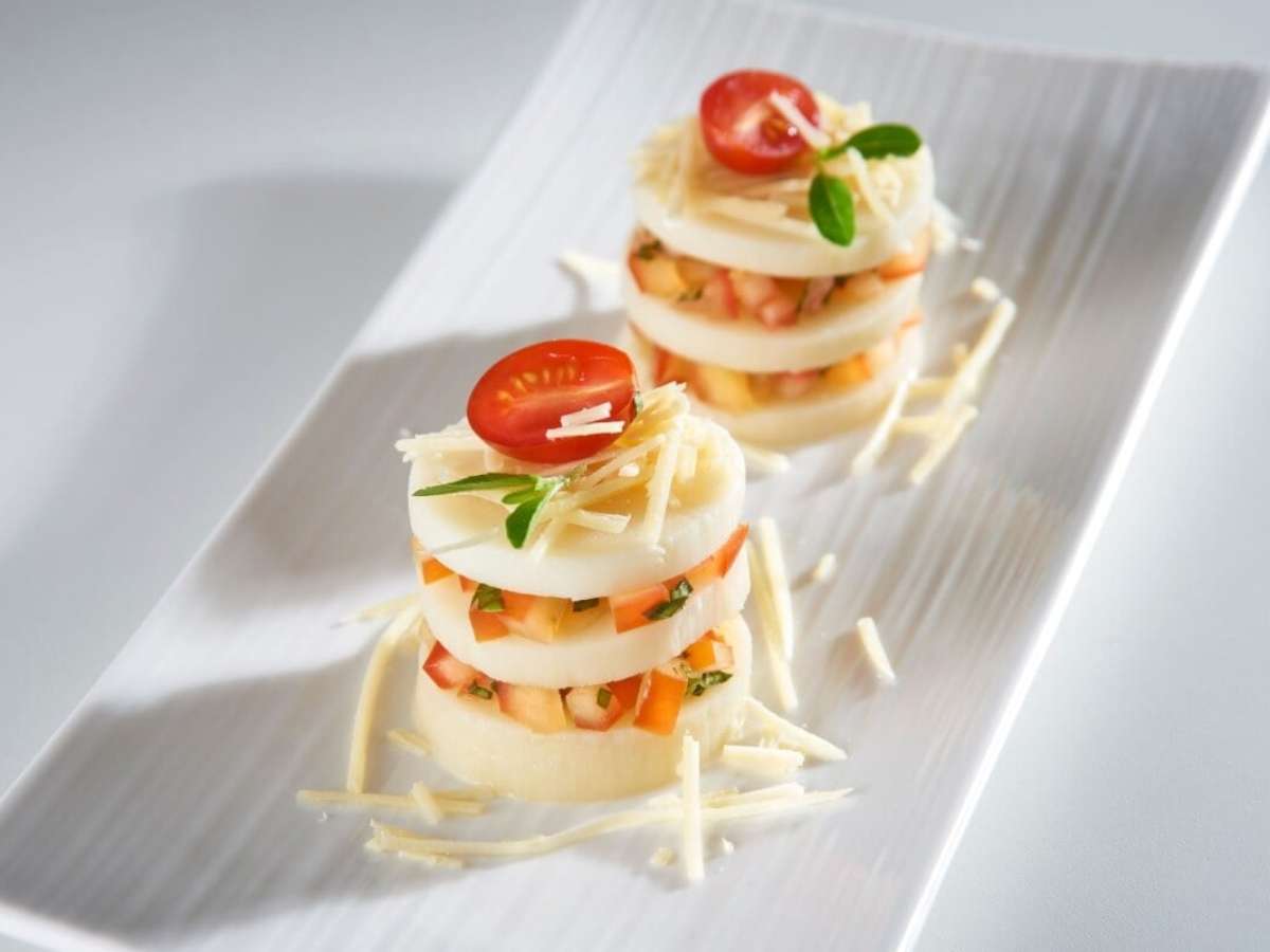 Em um recipiente, misture o tomate com sal, pimenta-do-reino e um fio de azeite. Em um prato, faça camadas alternadas de rodelas de palmito, tomate e queijo parmesão ralado. Decore com folhas de manjericão. Regue com mais um fio de azeite, se desejar. Sirva imediatamente.
