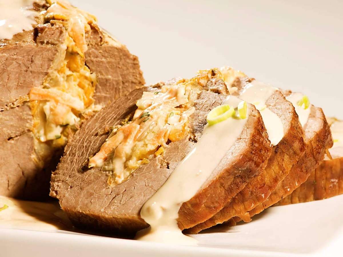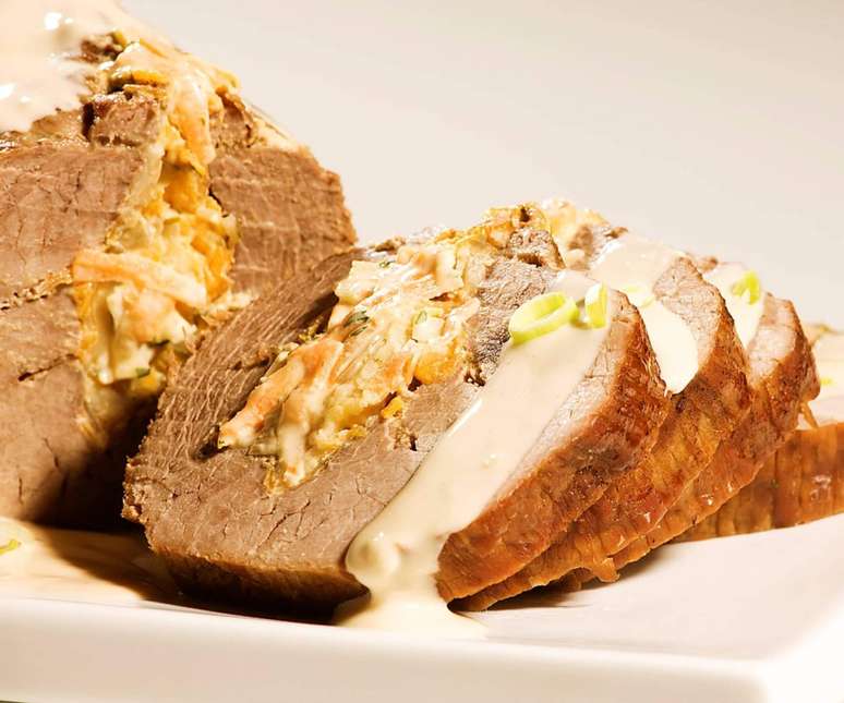 Com uma faca afiada, corte a carne ao meio, no sentido do comprimento e sem separar as partes, formando um bolso. Tempere com o sal e reserve. Em uma tigela pequena, coloque o alho-poró, a cenoura, o pão, o cheiro-verde e uma colher de sopa de maionese. Misture e recheie a carne. Prenda as bordas da carne com palitos de madeira e reforce com barbante para não vazar o recheio. Reserve.
