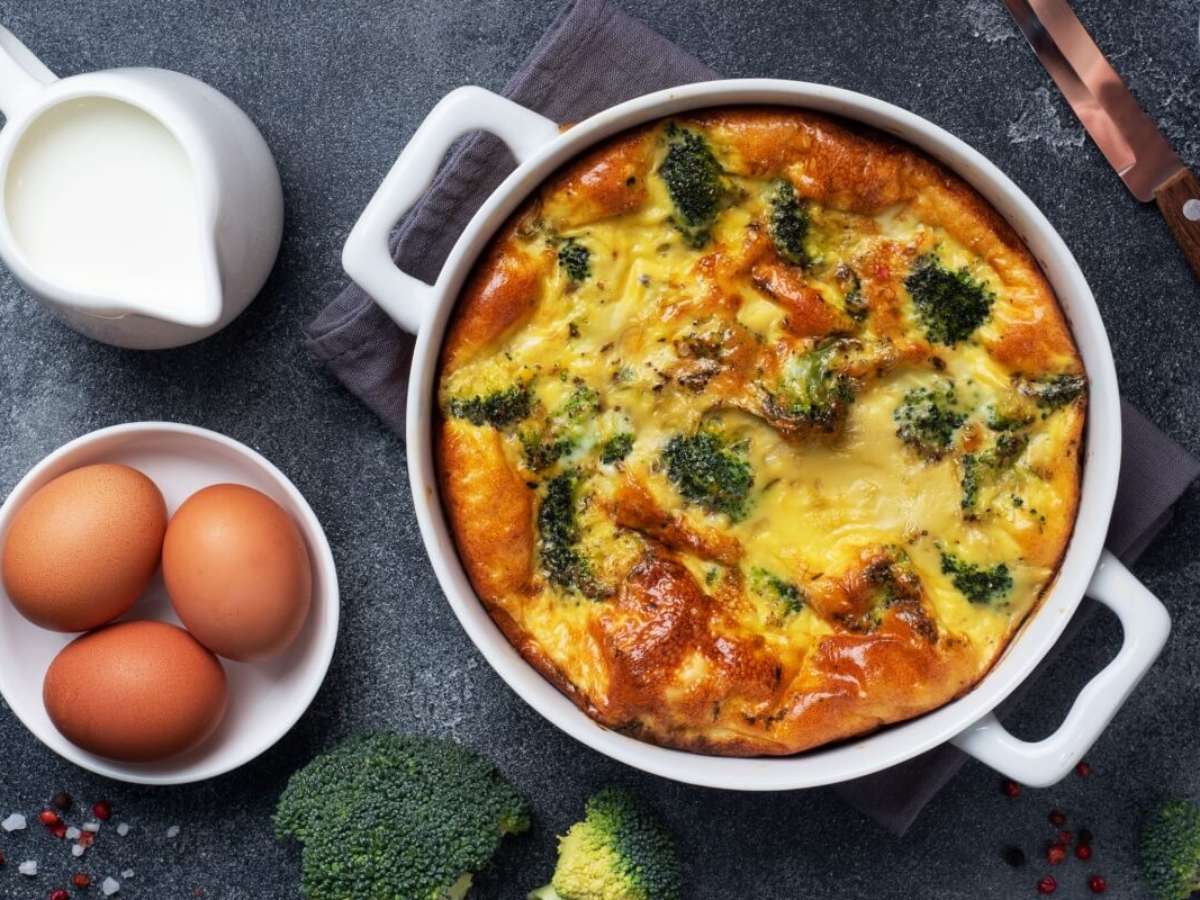 Em uma tigela, bata os ovos por aproximadamente 2 minutos. Adicione o leite, o queijo, a farinha de grão-de-bico, o sal e a pimenta-do-reino. Misture bem e reserve. Em um forma untada, distribua os floretes de brócolis e cubra com a mistura de ovos batidos. Leve ao forno preaquecido a 180ºC por aproximadamente 20 minutos. Retire do forno e sirva em seguida.