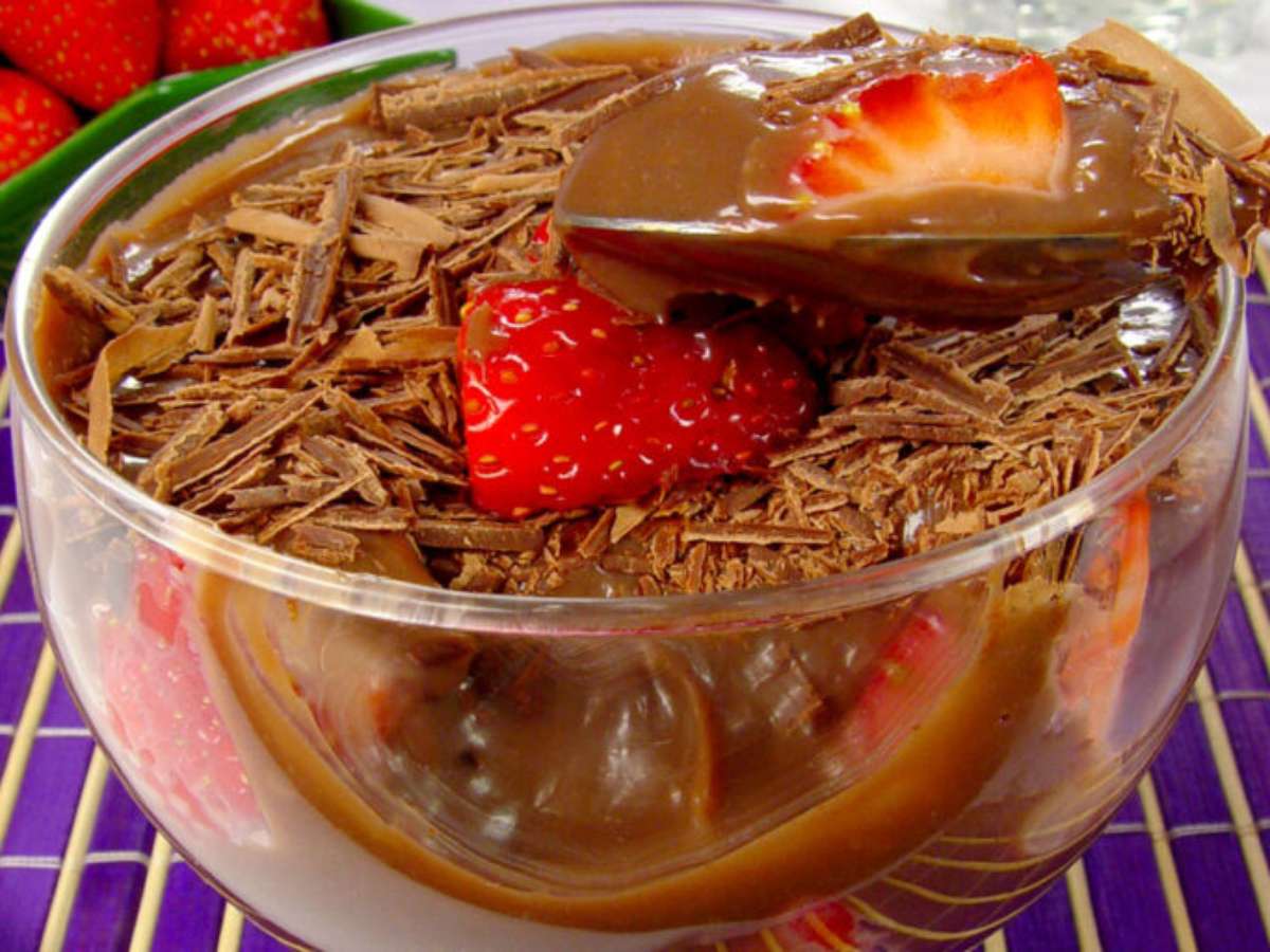 Despeje em taças individuais e decore com raspas de chocolate e morangos. Sirva em seguida ou mantenha na geladeira até o momento de servir.