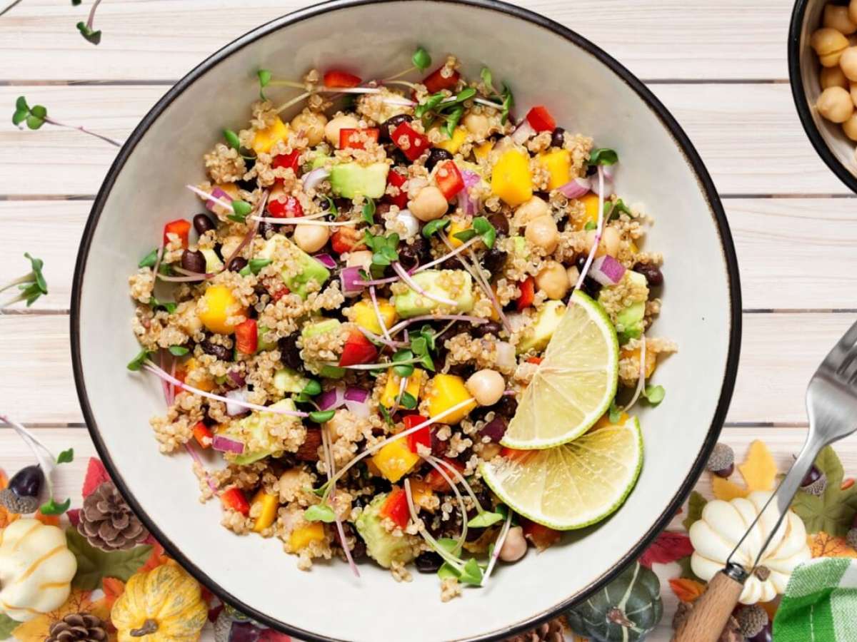 Em uma saladeira, misture a quinoa cozida, o grão-de-bico, o feijão-preto, o abacate, a manga, o pimentão vermelho e a cebola roxa. Tempere com o suco de limão, o azeite, o sal e a pimenta-do-reino e misture delicadamente. Finalize com os microverdes e decore com as fatias de limão. Sirva em seguida.