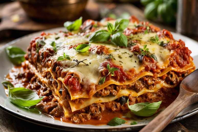 Após, em um refratário grande, coloque uma fina camada de molho. Cubra com a massa de lasanha, depois mais molho, fatias de muçarela e polvilhe com queijo parmesão. Repita as camadas até terminar os ingredientes, finalizando com bastante molho, muçarela e parmesão por cima. Polvilhe orégano e leve ao forno preaquecido a 200 °C por cerca de 35 minutos, até gratinar bem e o queijo ficar dourado. Retire do forno e deixe descansar por 10 minutos antes de cortar. Decore com folhas frescas de manjericão e sirva quente.