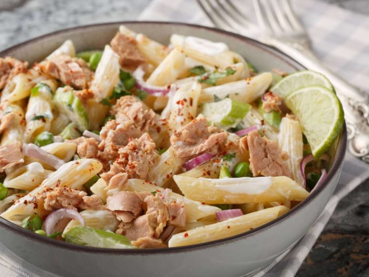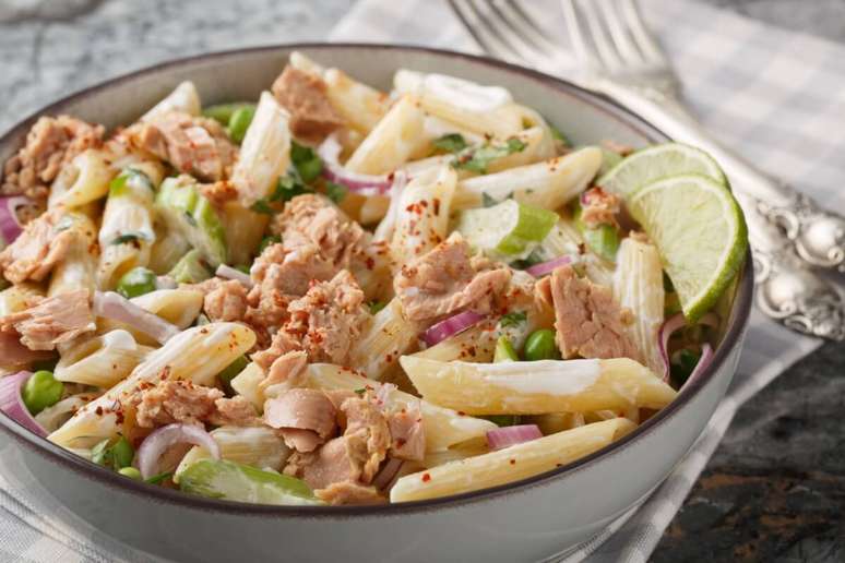 Em uma panela, ferva a água em fogo médio. Adicione uma colher de sopa de sal e o macarrão. Cozinhe até ficar al dente. Escorra e reserve. Em uma tigela grande, misture o iogurte, o suco de limão, o azeite, o sal e a pimenta-do-reino. Acrescente o atum, a ervilha, a cebola-roxa e o aipo ao molho e misture bem. Adicione o macarrão frio e mexa delicadamente para envolver todos os ingredientes. Leve a geladeira por 30 minutos. Decore com rodelas de limão e sirva em seguida.