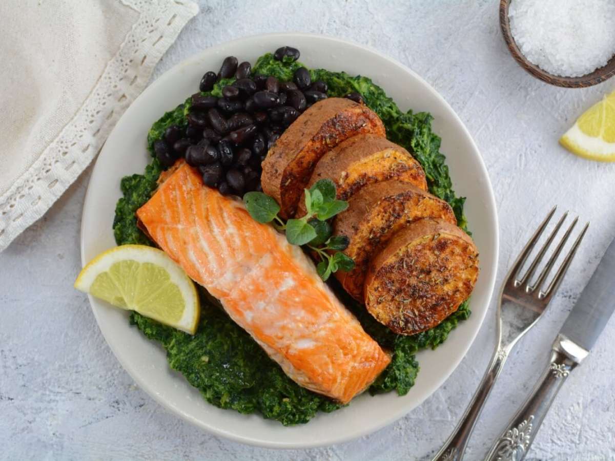 Em um prato, coloque uma porção de espinafre refogado como base. Acrescente uma concha de feijão-preto cozido ao lado. Disponha o salmão grelhado e as rodelas de batata-doce assada. Finalize com fatias de limão e folhas frescas de orégano.