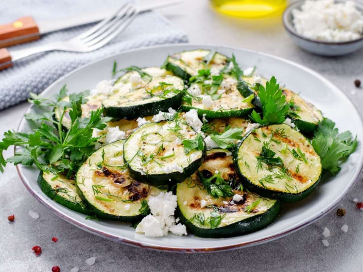 Em um recipiente, coloque as abobrinhas e tempere com sal, pimenta-do-reino e azeite de oliva. Leve uma frigideira antiaderente ao fogo médio para aquecer. Disponha as rodelas de abobrinha na frigideira e grelhe-as por 3 minutos de cada lado. Desligue o fogo, transfira as rodelas de abobrinha para um prato e salpique com o queijo feta. Finalize com a salsinha e o endro. Sirva em seguida.