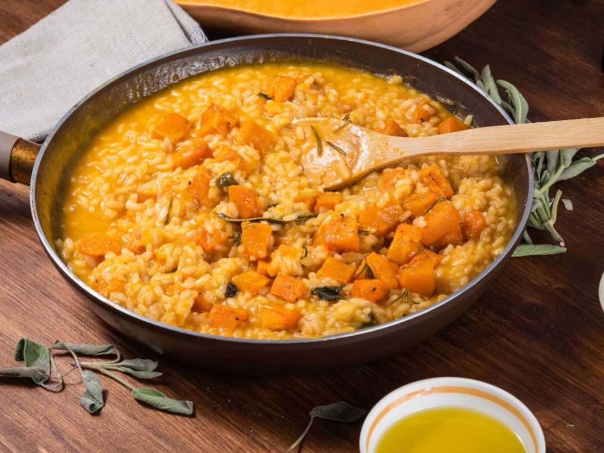 Em fogo médio, aqueça um fio de azeite em uma frigideira e refogue os cubos de abóbora-cabotiá com uma pitada de sal, a sálvia e o alecrim. Cozinhe até ficarem macios e levemente dourados. Reserve. Em outra panela, aqueça o azeite e refogue a cebola até ficar transparente. Adicione o arroz e mexa por 1-2 minutos, para que os grãos fiquem envoltos na gordura. Acrescente o vinho branco e mexa até evaporar.