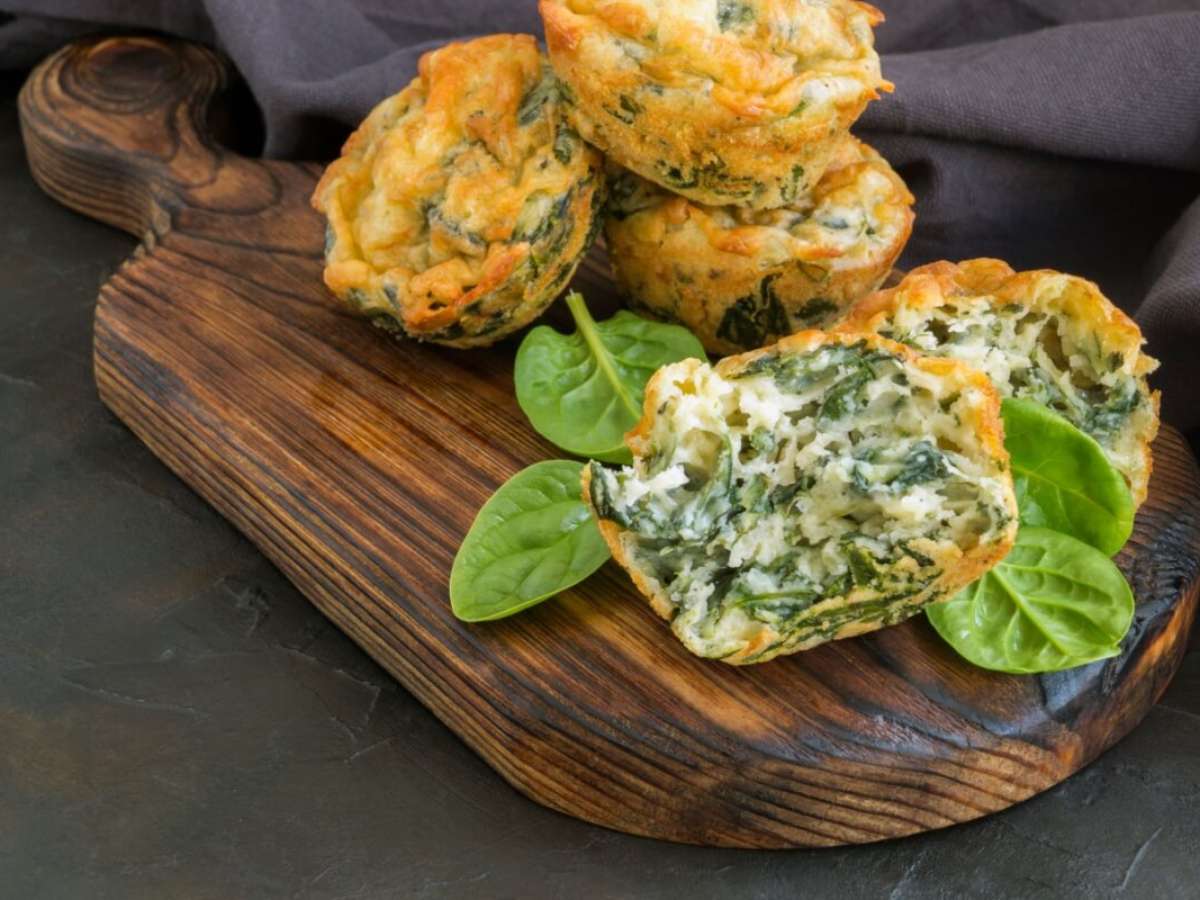 Em água corrente, lave o espinafre, seque bem e pique em pequenos pedaços. Transfira para um recipiente, adicione a cebola, o alho, a farinha de arroz, a fécula de batata, o sal, o curry, o fermento em pó e o azeite e misture até obter uma consistência homogênea. Distribua a massa em forminhas de cupcake untadas com azeite. Leve ao forno preaquecido a 180 °C por 45 minutos. Sirva em seguida.