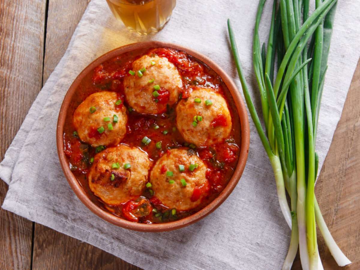 Após, com uma colher, pegue pequenas porções e modele no formato de bolinhas. Disponha em uma forma untada com azeite de oliva e leve ao forno preaquecido em temperatura média até dourar. Retire do forno e acrescente o molho de tomate. Sirva decorado com cebolinha.