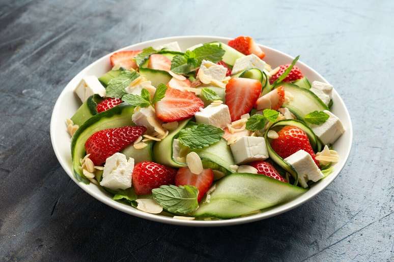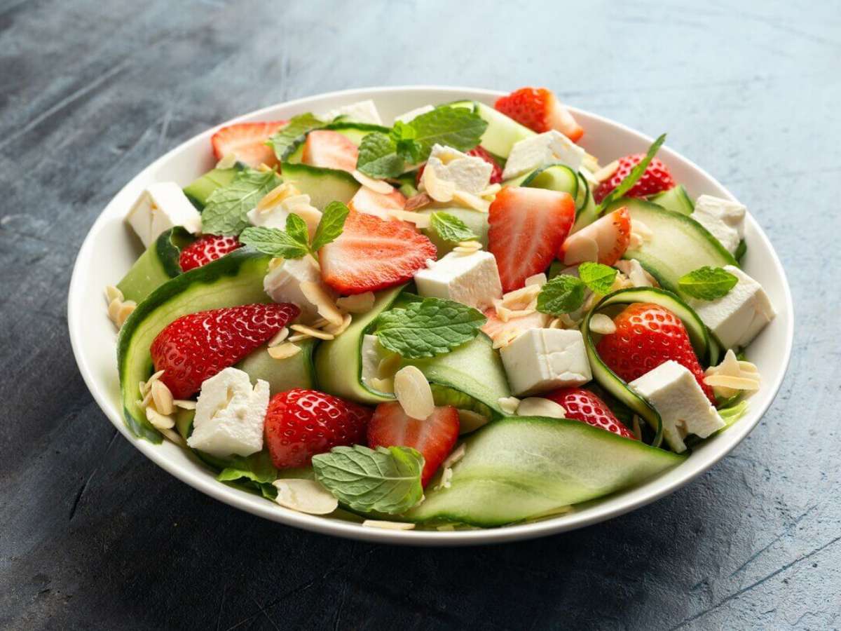 Em um recipiente, coloque o pepino, o queijo branco, as folhas de hortelã, as amêndoas e os morangos e misture bem. Reserve. Em outro recipiente, coloque o azeite, o vinagre, o mel e o sal e misture bem. Despeje o molho sobre a salada, mexa para incorporar com os demais ingredientes e sirva em seguida.