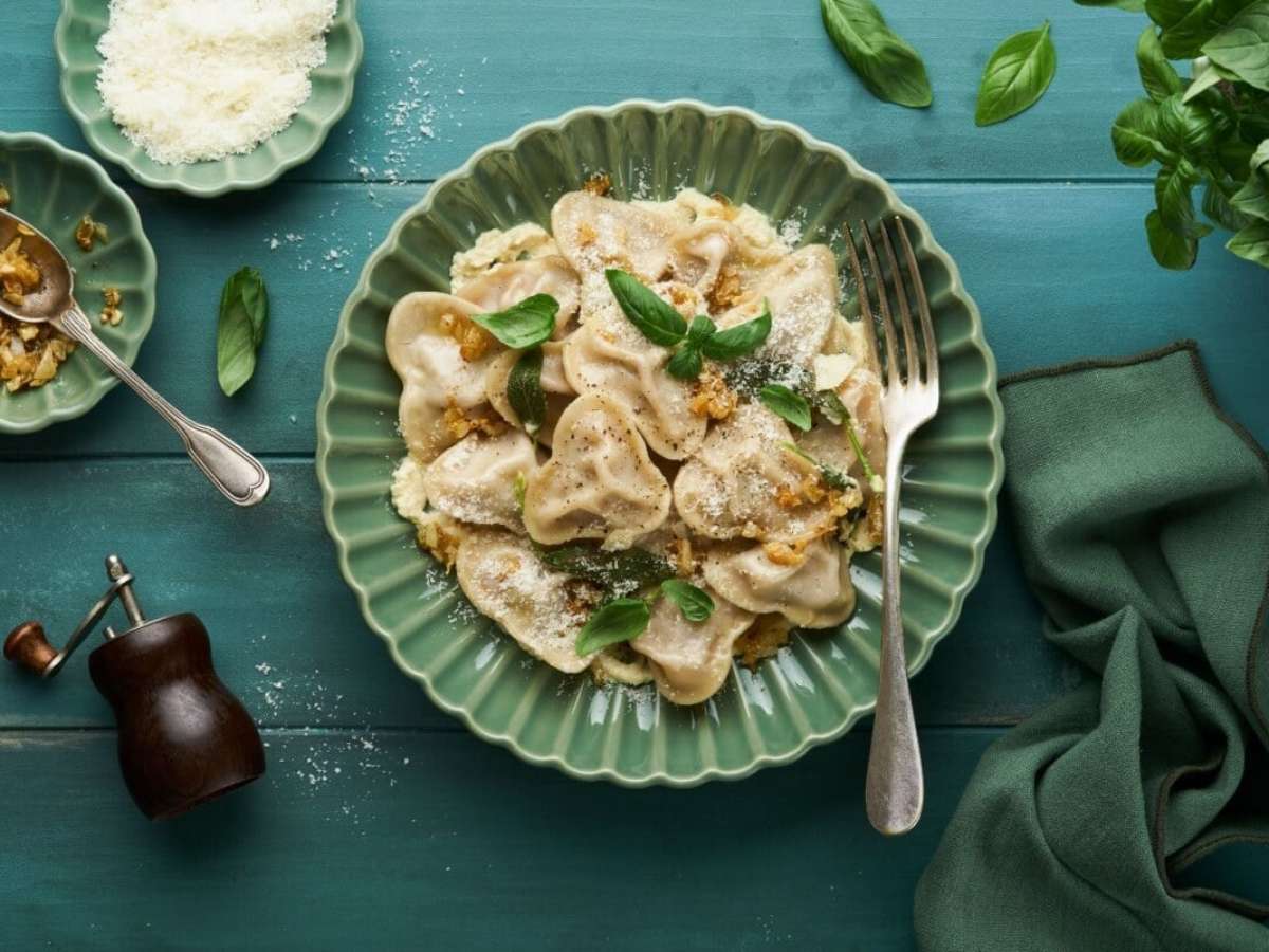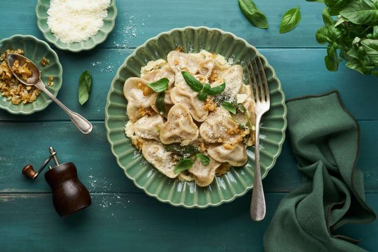 Ravioli com carne e cebola caramelizada