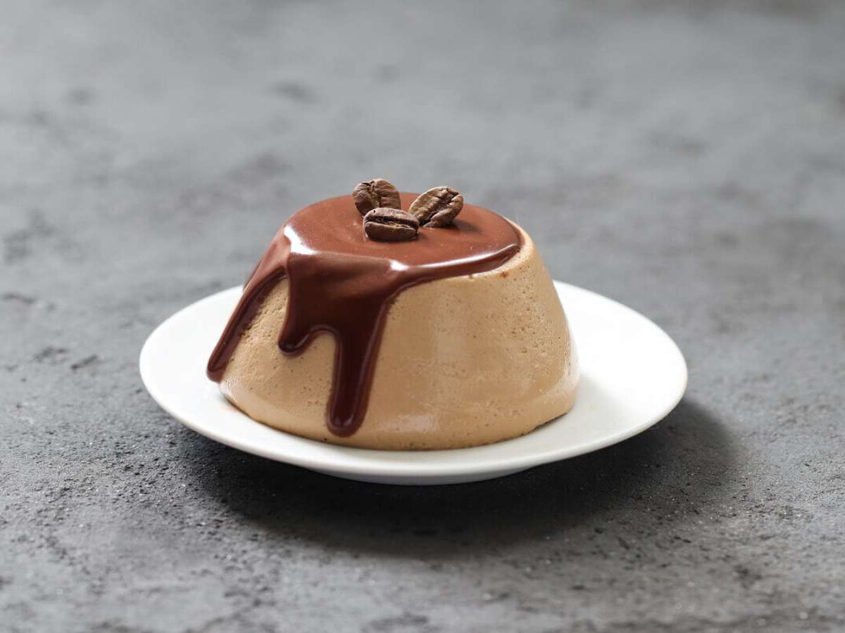 Em uma panela, coloque o leite de soja, o leite de coco, o melado, o ágar-ágar, a essência de baunilha e o café e misture bem. Leve ao fogo médio até levantar fervura, mexendo sempre. Desligue o fogo, distribua a mistura em taças e leve à geladeira até ficar firme. Após, retire da geladeira, desenforme com cuidado e decore com o chocolate derretido e os grãos de café. Sirva em seguida.
