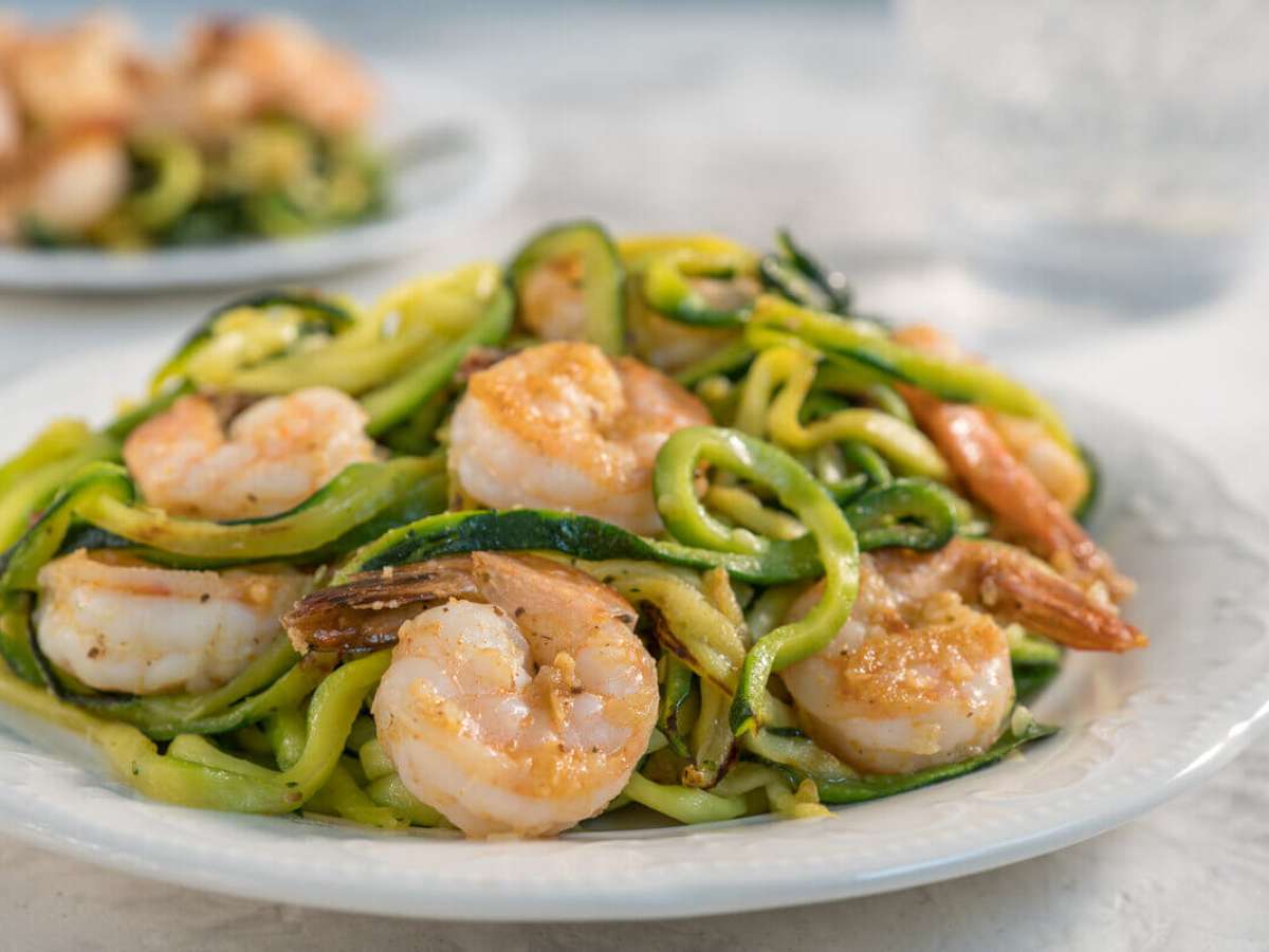 Em uma panela, coloque o azeite de oliva e metade da manteiga e leve ao fogo médio para aquecer. Adicione o alho e o camarão e doure. Desligue o fogo e reserve. Em outra panela, coloque o azeite de oliva, o restante da manteiga e a abobrinha fatiada e misture. Leve ao fogo médio para refogar por 4 minutos. Tempere com sal e pimenta-do-reino. Desligue o fogo e junte os camarões ao macarrão. Sirva em seguida.