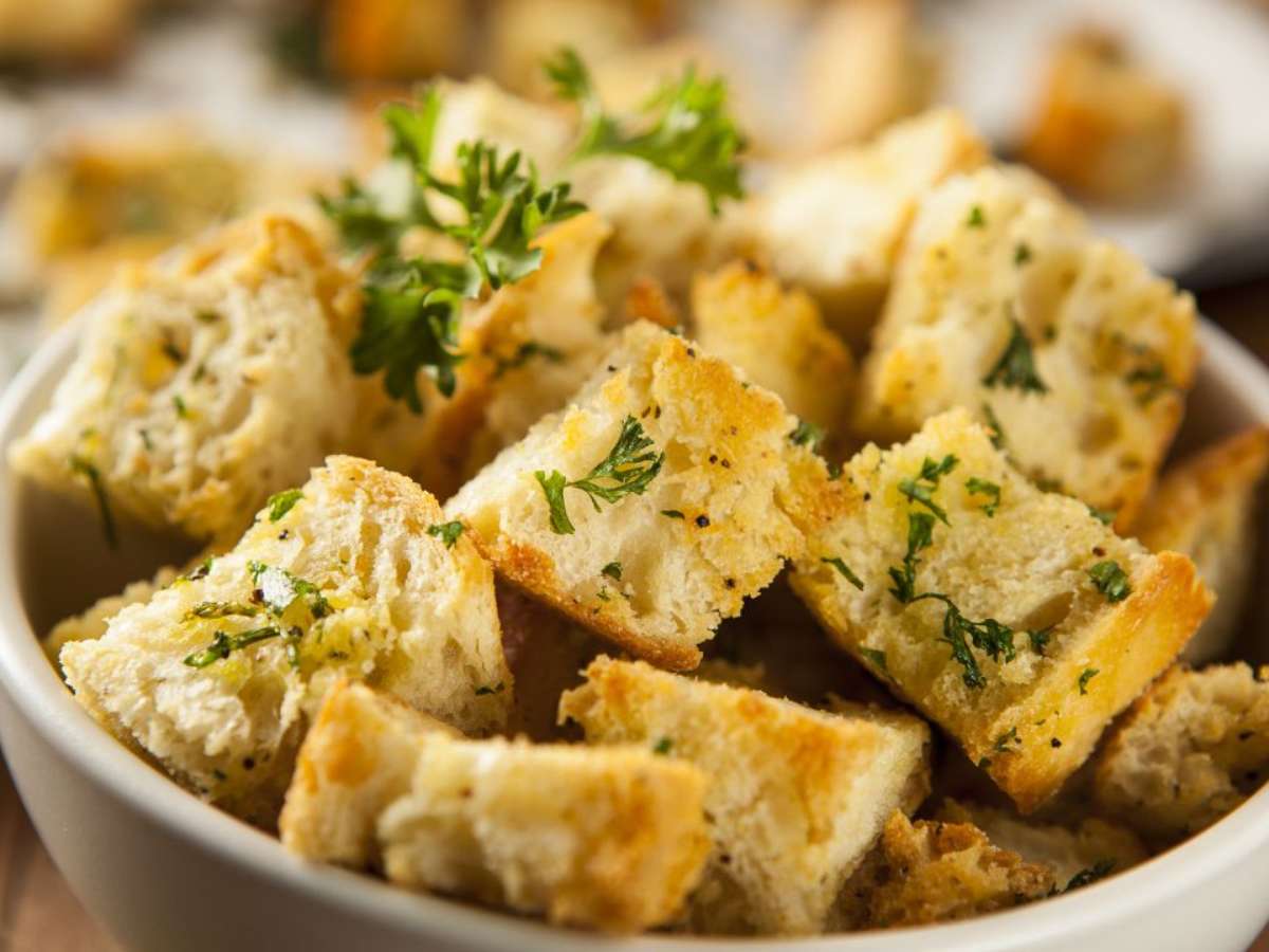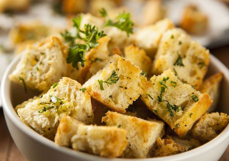 - Coloque os cubos de pão em uma assadeira, regue com o azeite, polvilhe o orégano e o alho e misture.