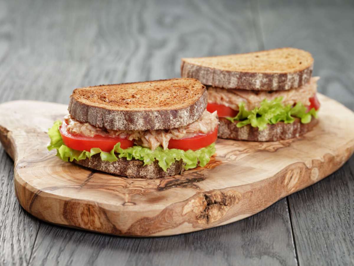 Toste as fatias de pão em uma frigideira em fogo baixo e reserve. Em um recipiente, misture o peixe desfiado com a maionese, o cream cheese e a cebolinha picada. Tempere com sal e pimenta-do-reino. Espalhe a mistura sobre uma das fatias de pão integral. Coloque a folha de alface, as fatias de tomate e as fatias de queijo sobre a mistura de peixe. Cubra com a outra fatia de pão integral e sirva.