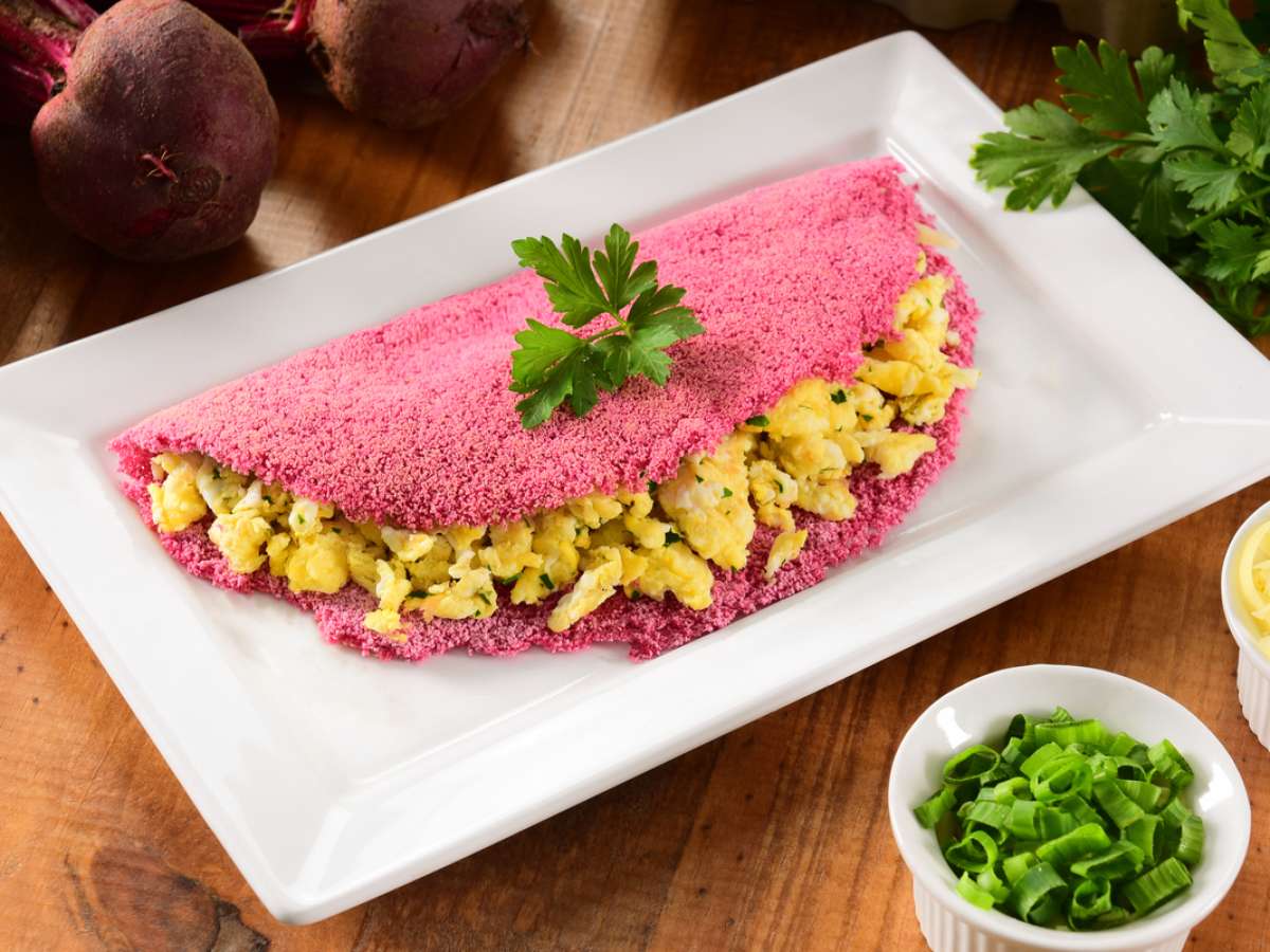 Tapioca de beterraba com ovo mexido