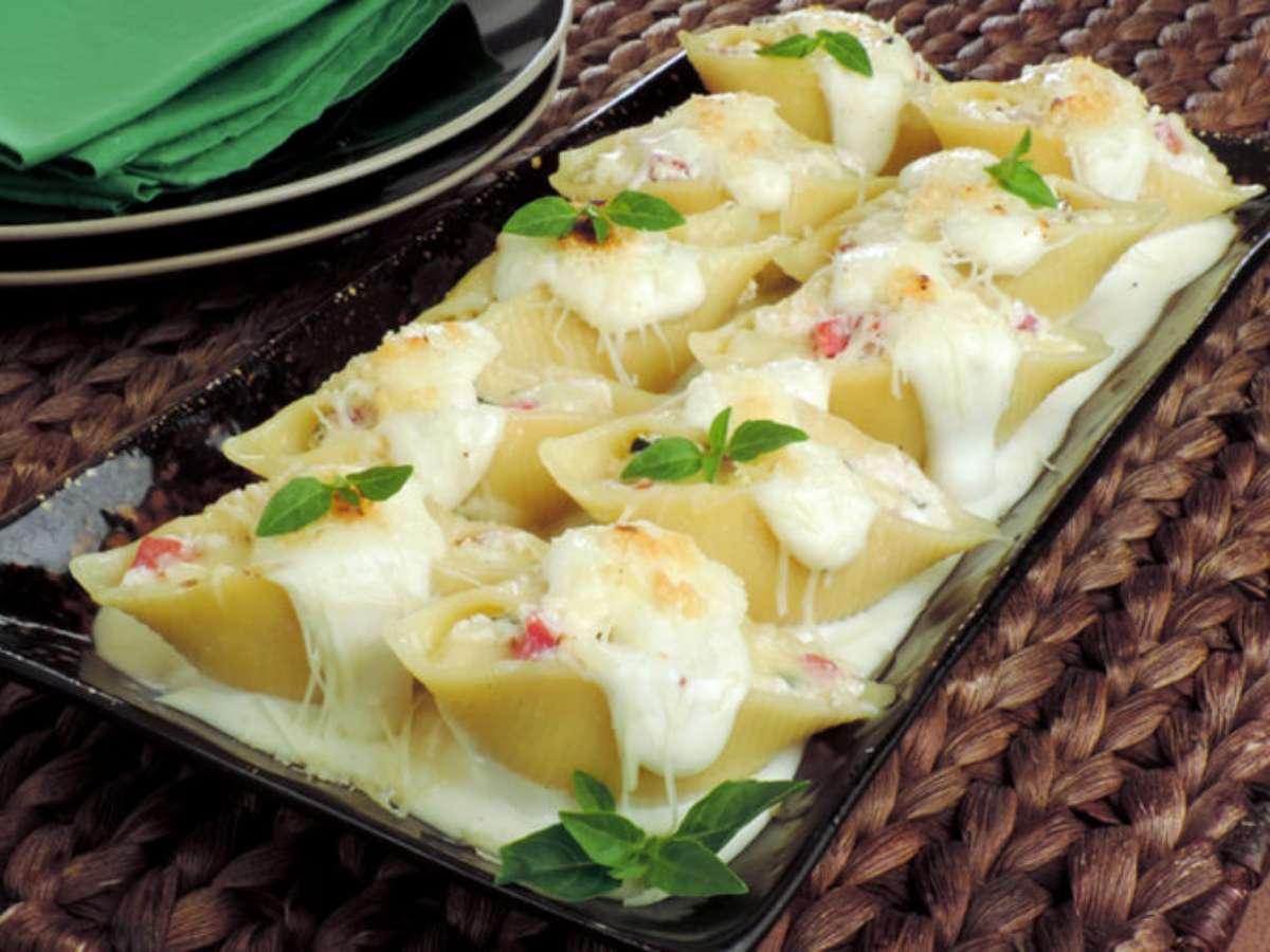 Espalhe o molho em um refratário grande. Sobre o molho, arrume os conchigliones recheados. Polvilhe com queijo parmesão, regue com azeite, cubra com papel-alumínio e leve ao forno médio, preaquecido, por 20 minutos ou até gratinar. Retire o papel-alumínio e sirva em seguida, se desejar, decorado com folhas de manjericão.