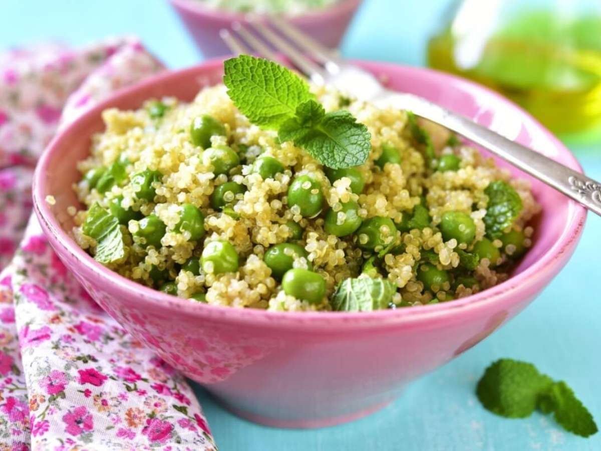 Em água corrente, lave a quinoa, escorra e disponha em uma panela. Cubra com água, coloque sal e leve ao fogo médio para cozinhar por 15 minutos após ferver. Desligue o fogo, espere esfriar, escorra a água, transfira a quinoa para um recipiente, tampe e deixe descansar por 20 minutos. Após, adicione as folhas de hortelã, a ervilha, o vinagre, o azeite, o suco de limão, o sal e a pimenta-do-reino e misture bem. Leve à geladeira por 1 hora. Sirva em seguida.