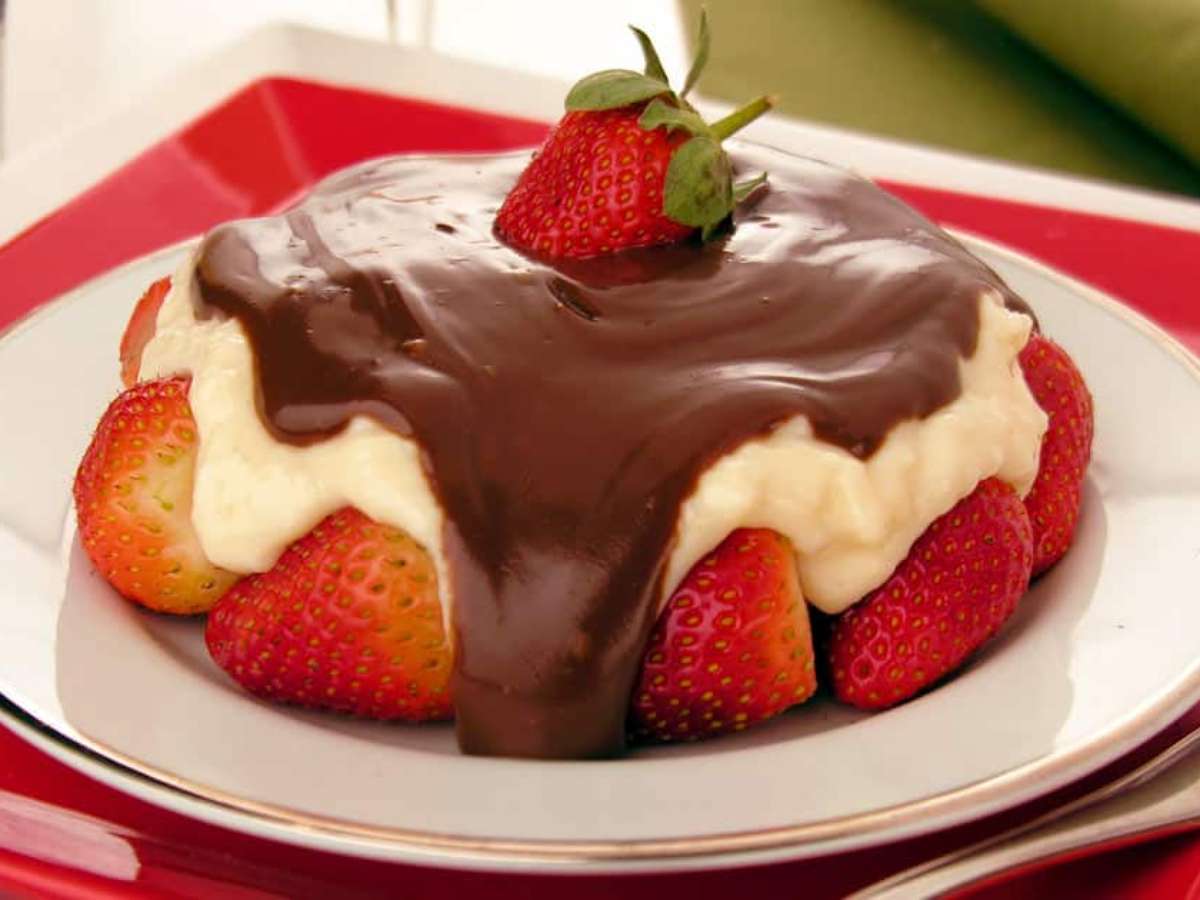 Coloque o creme branco já frio por cima dos morangos e depois o creme de chocolate.