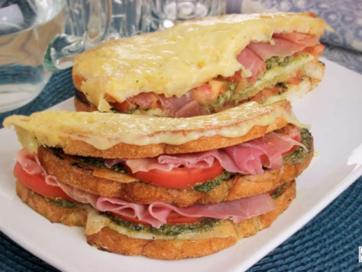 Para a montagem, coloque uma fatia de pão, um pouco de molho pesto, 2 fatias de presunto parma, 1/4 da muçarela de búfala, 1/4 do tomate e mais uma fatia de pão.