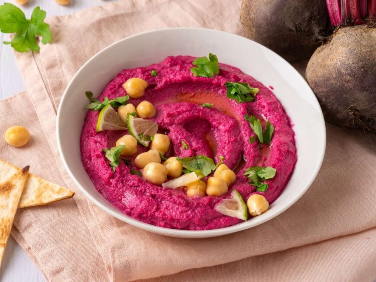 Em uma assadeira, coloque a beterraba, regue com azeite de oliva e leve ao forno preaquecido a 220 °C até ficar macia. Retire do forno e espere esfriar. Em um processador, coloque todos os ingredientes, inclusive a beterraba, e bata por 7 minutos. Transfira para um recipiente, cubra com plástico-filme e deixe descansar por 15 minutos.