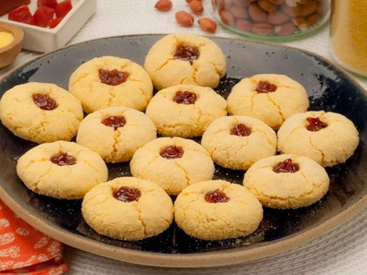 Em uma tigela, coloque os ovos, a essência de baunilha, o açúcar e bata ligeiramente com um garfo. Adicione o fubá, o amendoim e misture até homogeneizar. Em uma fôrma polvilhada com fubá, modele bolinhas e achate levemente com o dedo, formando um buraco pequeno. Em cada buraco coloque um cubo de goiabada. Leve ao forno médio, preaquecido, por 20 minutos. Deixe esfriar e sirva.