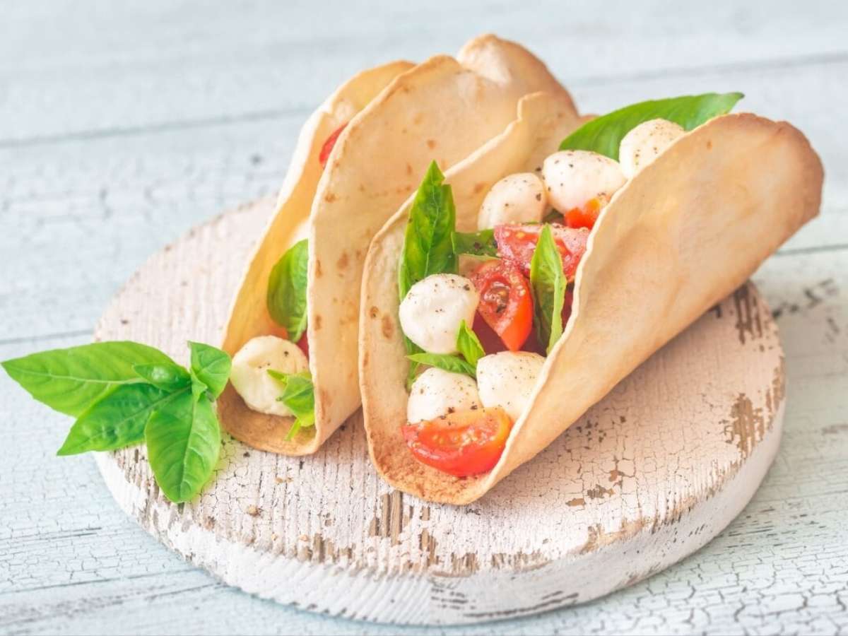 Aqueça uma frigideira em fogo médio. Coloque uma tortilha na frigideira e aqueça por cerca de 1 minuto de cada lado, até que comece a dourar levemente e fique mais firme. Coloque a tortilha aquecida sobre uma superfície plana. Distribua as bolinhas de muçarela de búfala e os tomates-cereja. Regue com azeite de oliva. Tempere com sal e pimenta-do-reino moída. Em seguida, adicione as folhas de manjericão por cima dos ingredientes. Dobre a tortilha, pressionando levemente para que os ingredientes se mantenham no lugar. Sirva imediatamente.