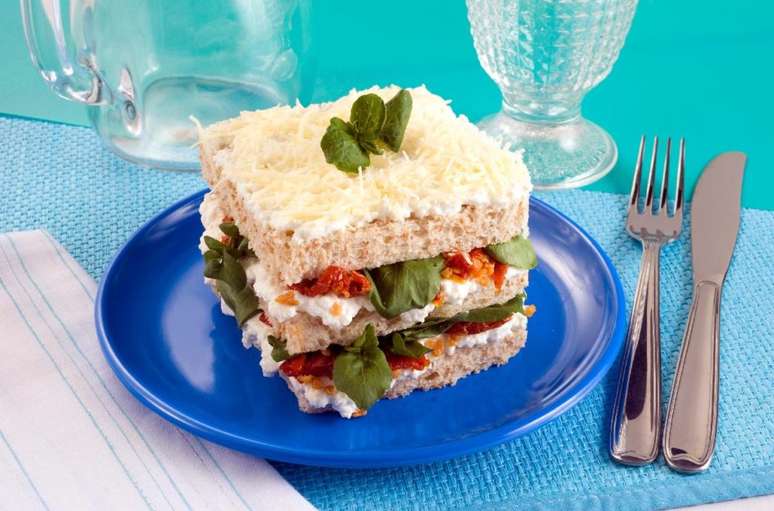 Bata no liquidificador a azeitona, o cheiro-verde e a maionese até formar um creme. Em uma fôrma de bolo inglês média forrada com filme plástico, intercale camadas de pão de fôrma, de creme de azeitonas e de tomate seco, terminando em pão e reservando parte do creme para decoração. Leve à geladeira por 2 horas. Retire, desenforme, retire o filme plástico, cubra com o creme de azeitona restante reservado e decore com azeitonas e tomate seco. Sirva.