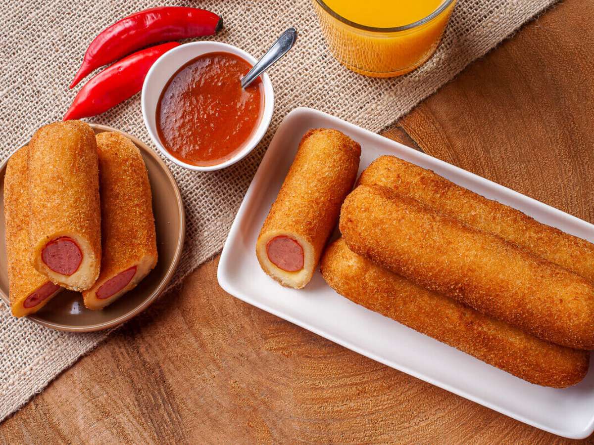 Com a ajuda de uma colher, pegue um pouco de massa e abra na palma da mão, recheie com a salsicha e feche enrolando ao redor dela, elevando a parte superior e inferior sobre as pontas. Repita o processo com toda a massa e passe os enroladinhos no ovo e na farinha de rosca. Reserve. Em uma panela, coloque o óleo e leve ao fogo médio para aquecer. Aos poucos, disponha os enroladinhos na panela e frite até dourar. Depois, coloque-os em um recipiente com papel-toalha para escorrer o excesso de óleo e sirva em seguida.