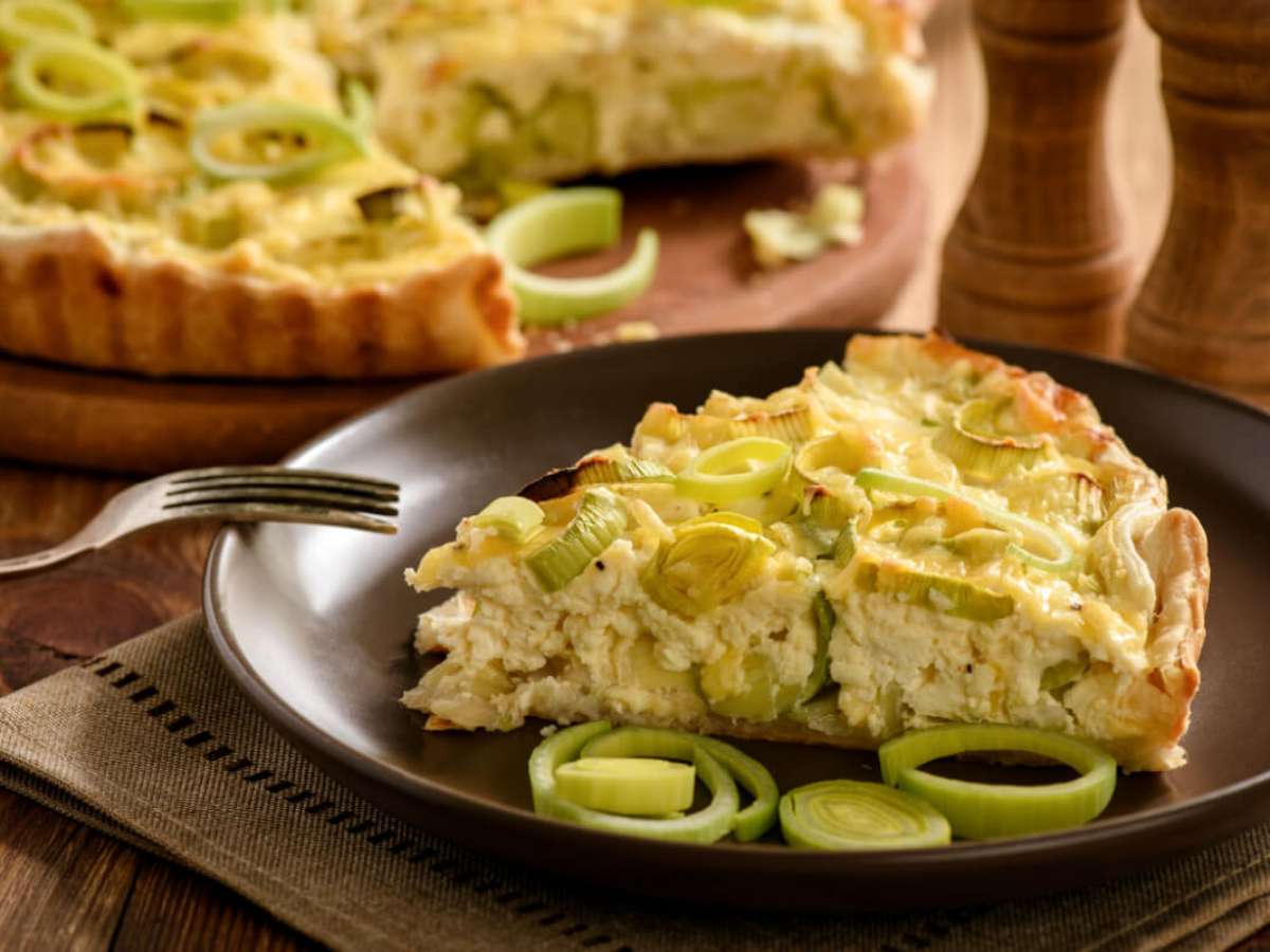 Em um recipiente, coloque os ovos e o tofu. Com o auxílio de um garfo, mexa bem e reserve. Em uma frigideira, aqueça o azeite em fogo médio e refogue a cebola e o alho-poró por aproximadamente 5 minutos. Tempere com sal e pimenta-do-reino. Desligue o fogo, transfira os vegetais para o recipiente com os ovos e o tofu e misture bem. Coloque todo o recheio na massa pré-assada e leve ao forno preaquecido a 180 °C por 40 minutos. Sirva em seguida.