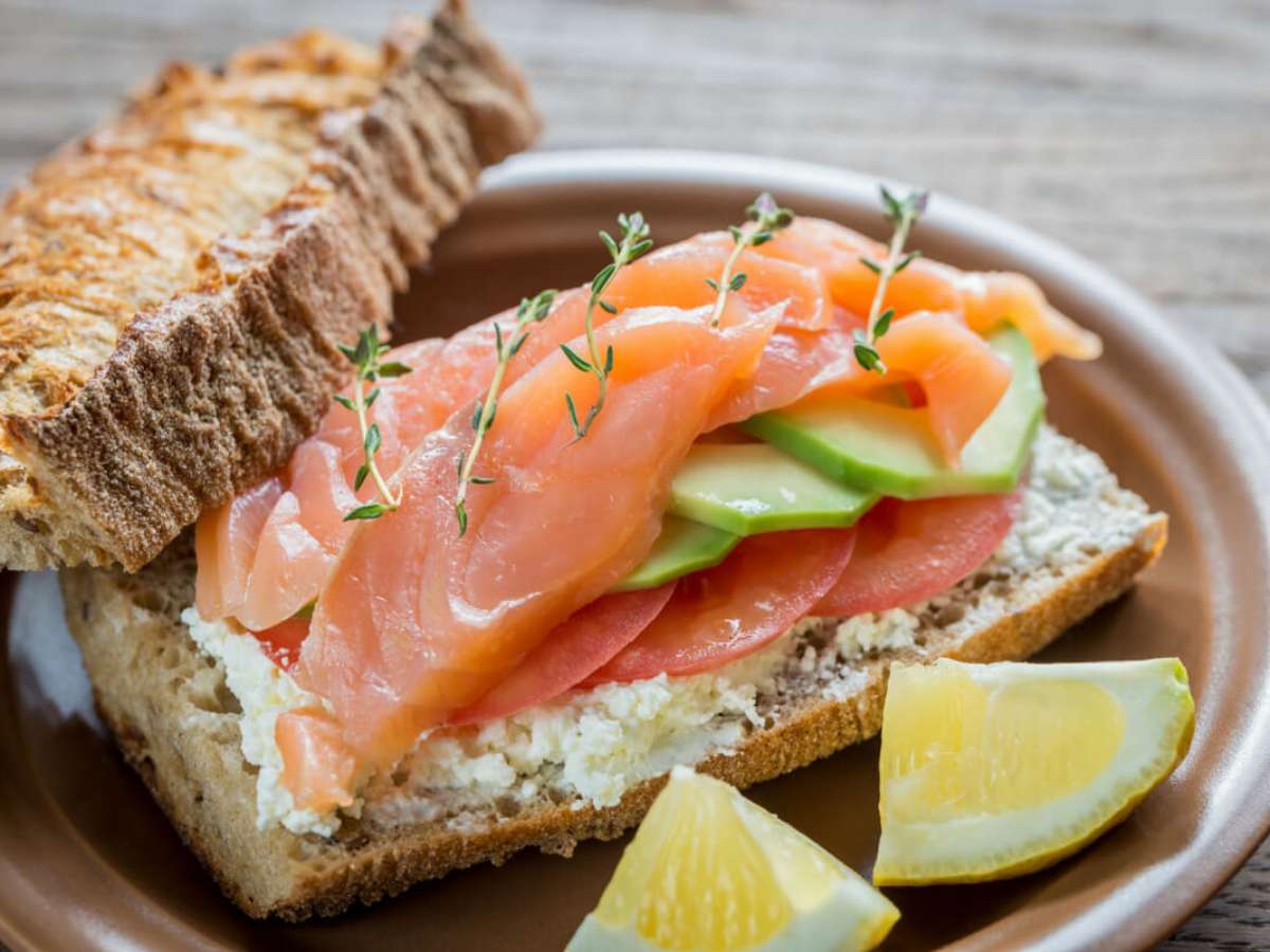 Espalhe o queijo cottage em uma das fatias de pão. Em seguida, coloque as fatias de abacate e tomate sobre o queijo. Disponha as fatias de salmão acima dos ingredientes. Tempere com suco de limão, tomilho, sal e pimenta-do-reino. Cubra o sanduíche com outra fatia de pão. Sirva em seguida.