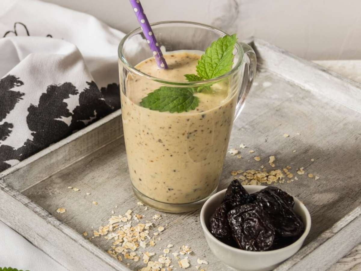 Em um liquidificador, coloque as bananas, as ameixas e o leite de aveia e bata até obter uma mistura homogênea. Adicione o farelo de aveia e as pedras de gelo e bata para incorporar. Transfira a vitamina para um copo e sirva em seguida.