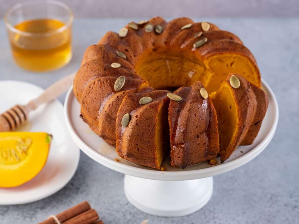Por último, coloque o fermento químico e misture. Transfira para uma forma redonda com furo central untada com óleo de coco e enfarinhada com farinha de aveia. Leve ao forno preaquecido em temperatura média por 45 minutos. Retire do forno, espere esfriar e desenforme com cuidado. Regue com o mel e polvilhe com as sementes de abóbora. Sirva em seguida.