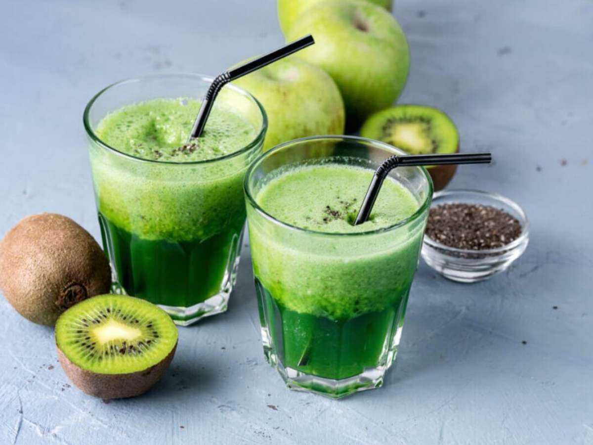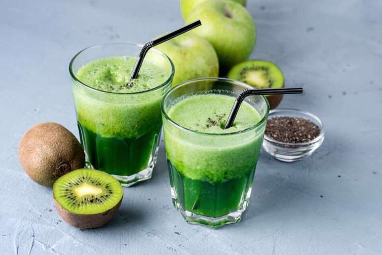 Em um liquidificador, coloque a água de coco, os kiwis e as maçãs-verdes e bata até obter uma bebida homogênea. Acrescente as sementes de chia e bata por mais 3 minutos. Transfira o suco para um copo e adicione as pedras de gelo. Sirva em seguida.