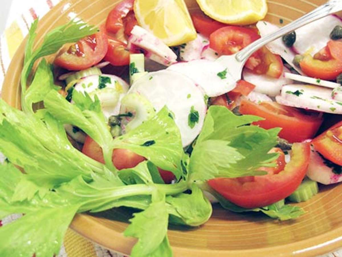 - Corte algumas folhas do aipo, corte as pontas do talo de aipo, em seguida em fatias finas. Corte os tomates no comprimento, descasque os rabanetes e corte-os em fatias finas. Misture as alcaparras e as azeitonas. Na hora de servir molhe com o suco de limão e polvilhe com sal.