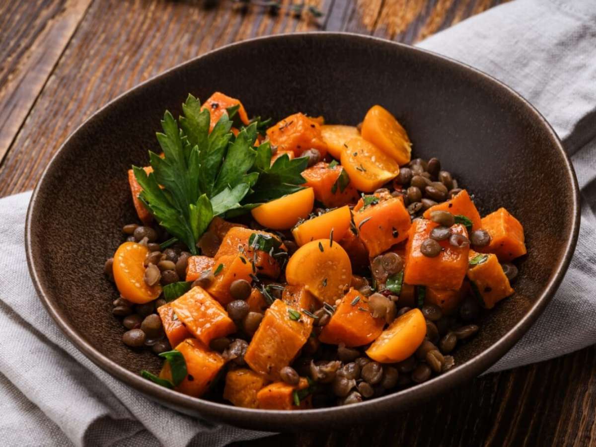 Em uma panela em fogo médio, cozinhe a batata-doce com água até ficar macia, mas ainda firme. Desligue o fogo, escorra e reserve. Em uma frigideira, aqueça o azeite de oliva em fogo médio e refogue a cebola e o alho até ficarem levemente dourados. Adicione a lentilha e refogue por 5 minutos. Acrescente a batata-doce e mexa com cuidado para não quebrar os cubos. Tempere com sal e pimenta-do-reino. Adicione o tomate-cereja e finalize com salsinha e tomilho. Sirva em seguida.