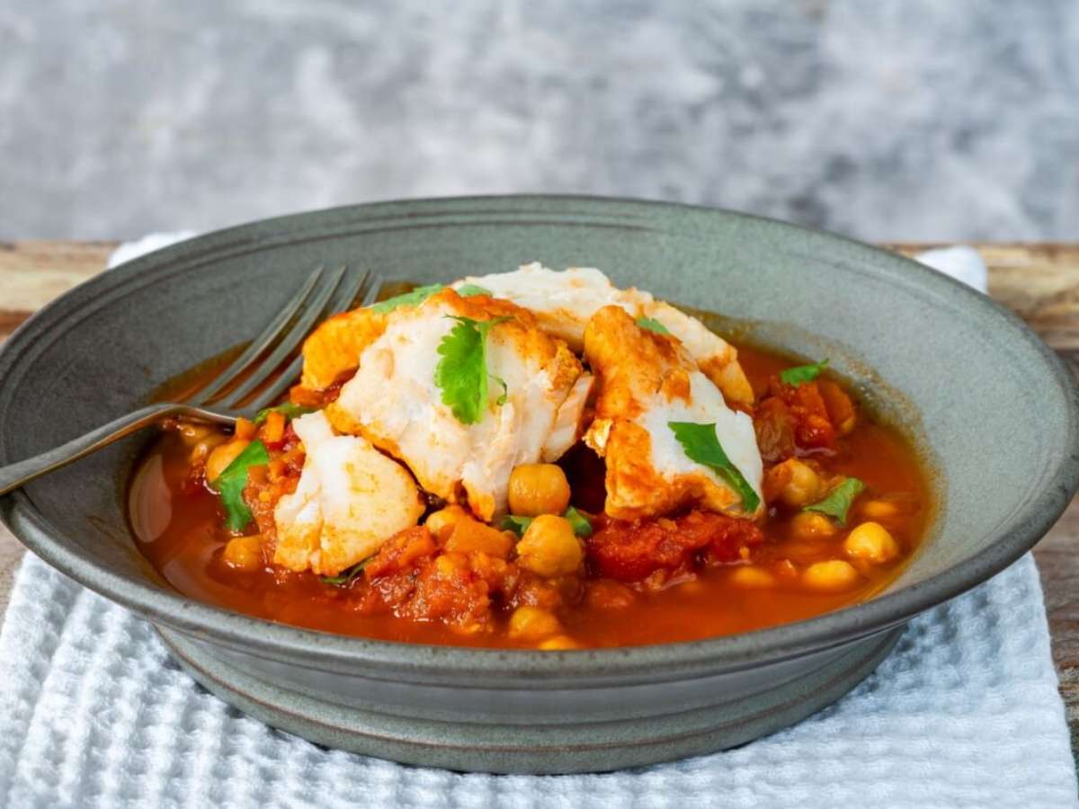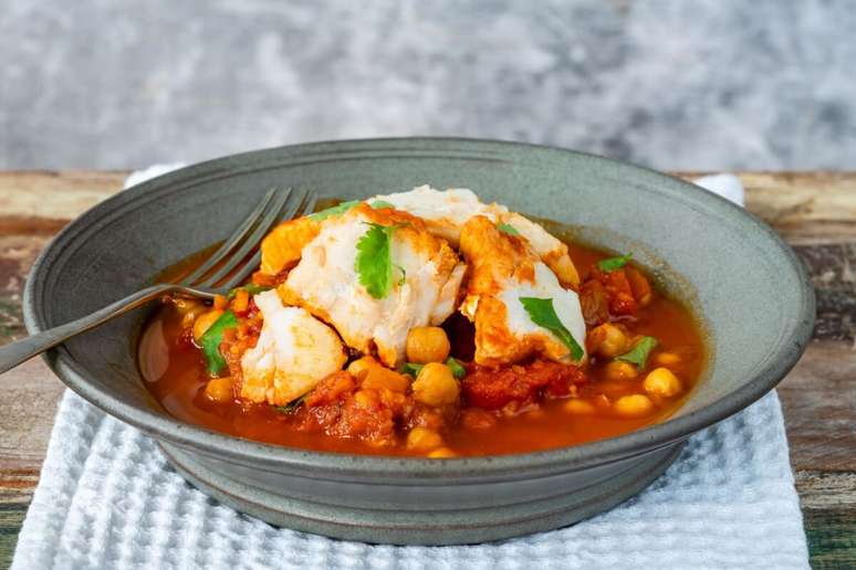 Reduza o fogo para médio baixo. Depois, coloque cuidadosamente os cubos de peixe dentro do molho, sem mexer excessivamente. Tampe parcialmente a panela e cozinhe por cerca de 8 minutos, até que o peixe esteja macio e cozido por dentro. Desligue o fogo e finalize com as folhas de coentro. Sirva em seguida.