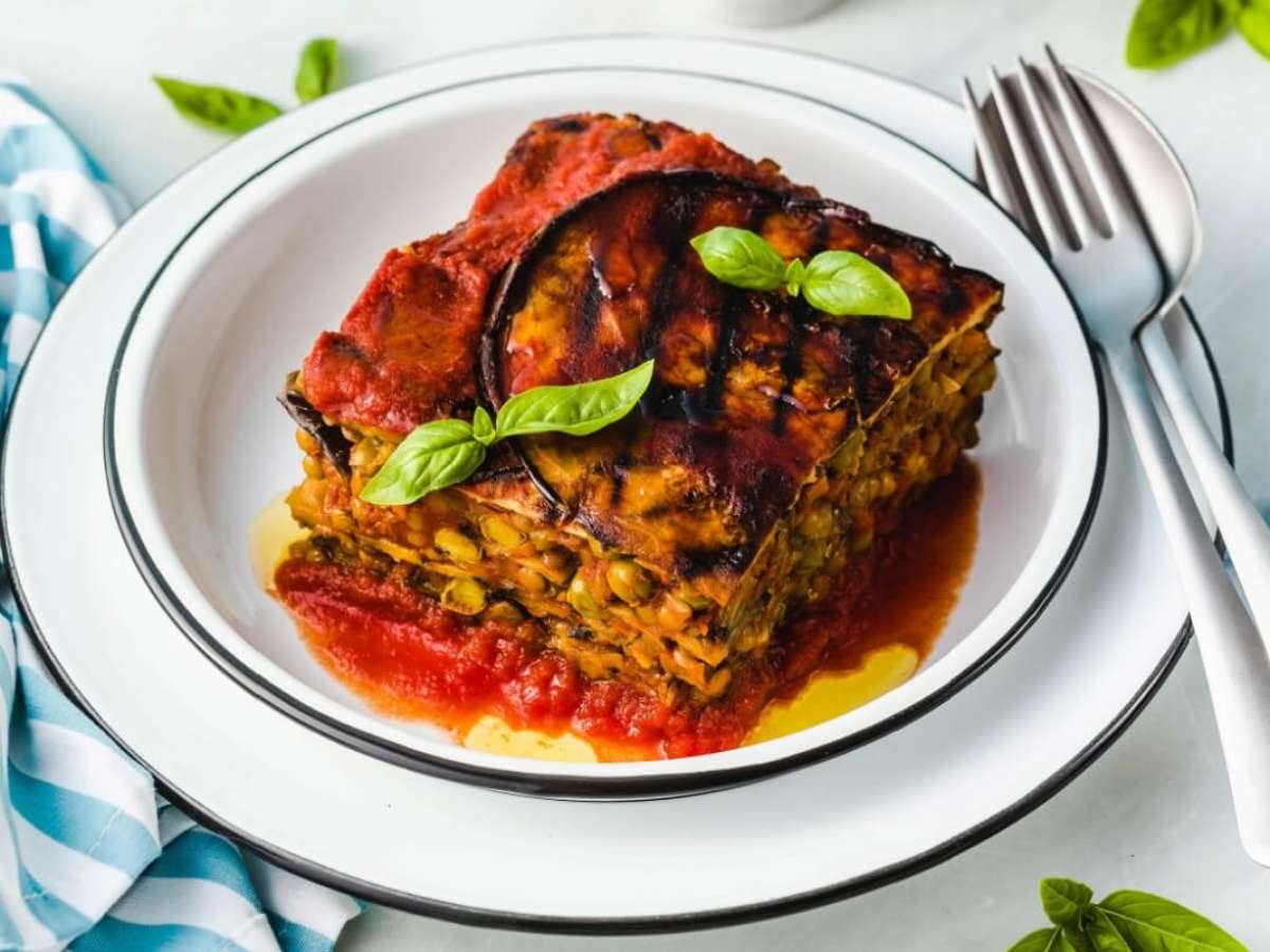 Em uma assadeira, espalhe um pouco do molho de tomate. Faça uma camada de berinjela. Distribua uma camada do molho de lentilha. Repita as camadas até terminar os ingredientes, finalizando com uma camada de berinjela e molho de tomate por cima. Leve ao forno preaquecido a 200 °C por 20 a 25 minutos para dourar e firmar a lasanha. Retire do forno, deixe descansar por 10 minutos para firmar o corte. Finalize com folhas de manjericão. Sirva em seguida.