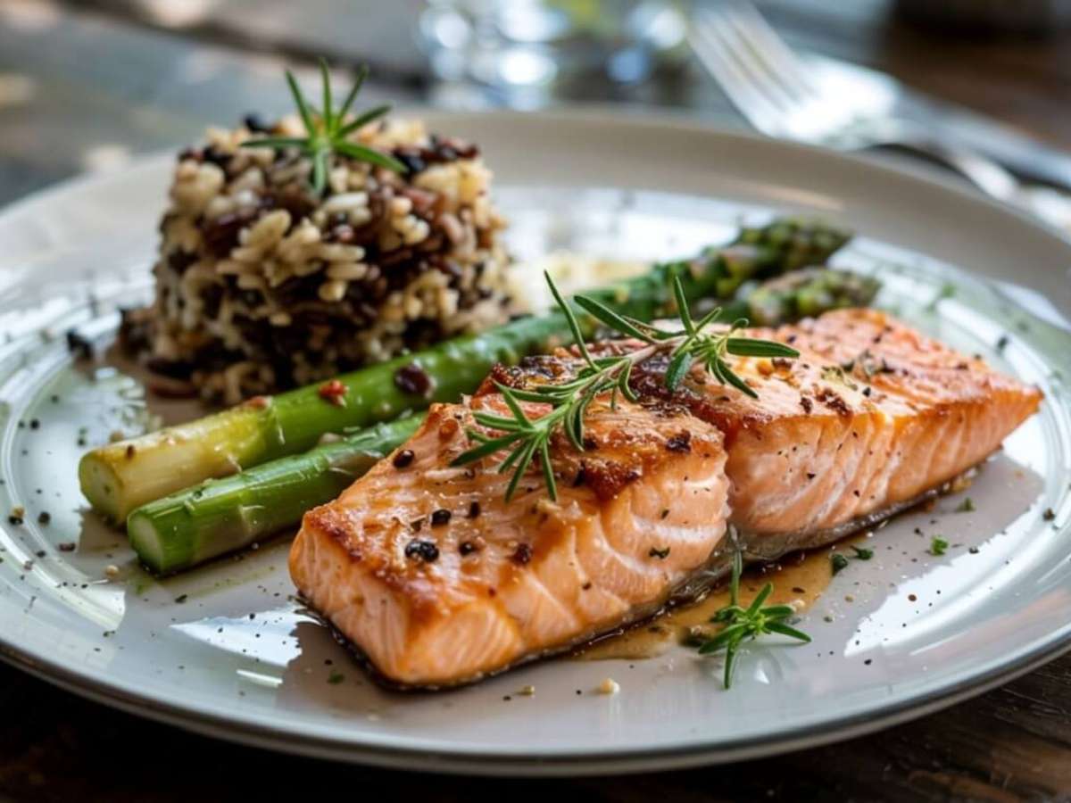 Em um recipiente, tempere os filés de salmão com sal, pimenta-do-reino e o suco de limão. Depois, aqueça uma frigideira antiaderente com o azeite em fogo médio-alto e coloque os filés com a pele voltada para baixo. Grelhe por cerca de 4 minutos, vire com cuidado e grelhe por mais 3 minutos, até dourar e atingir o ponto desejado. Finalize com ramos de alecrim fresco. Sirva o salmão acompanhado do arroz selvagem e dos aspargos grelhados.