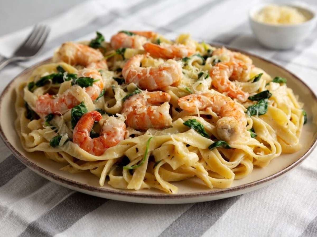 Em uma panela, coloque a água e leve ao fogo médio para ferver. Adicione uma colher de sopa de sal e cozinhe o fettuccine até ficar al dente. Escorra e reserve um pouco da água do cozimento. Depois, em uma frigideira grande, aqueça o azeite em fogo médio e refogue o alho e a cebola até dourarem levemente. Acrescente o camarão e grelhe por cerca de 2 minutos de cada lado, até ficar rosado. Retire e reserve.