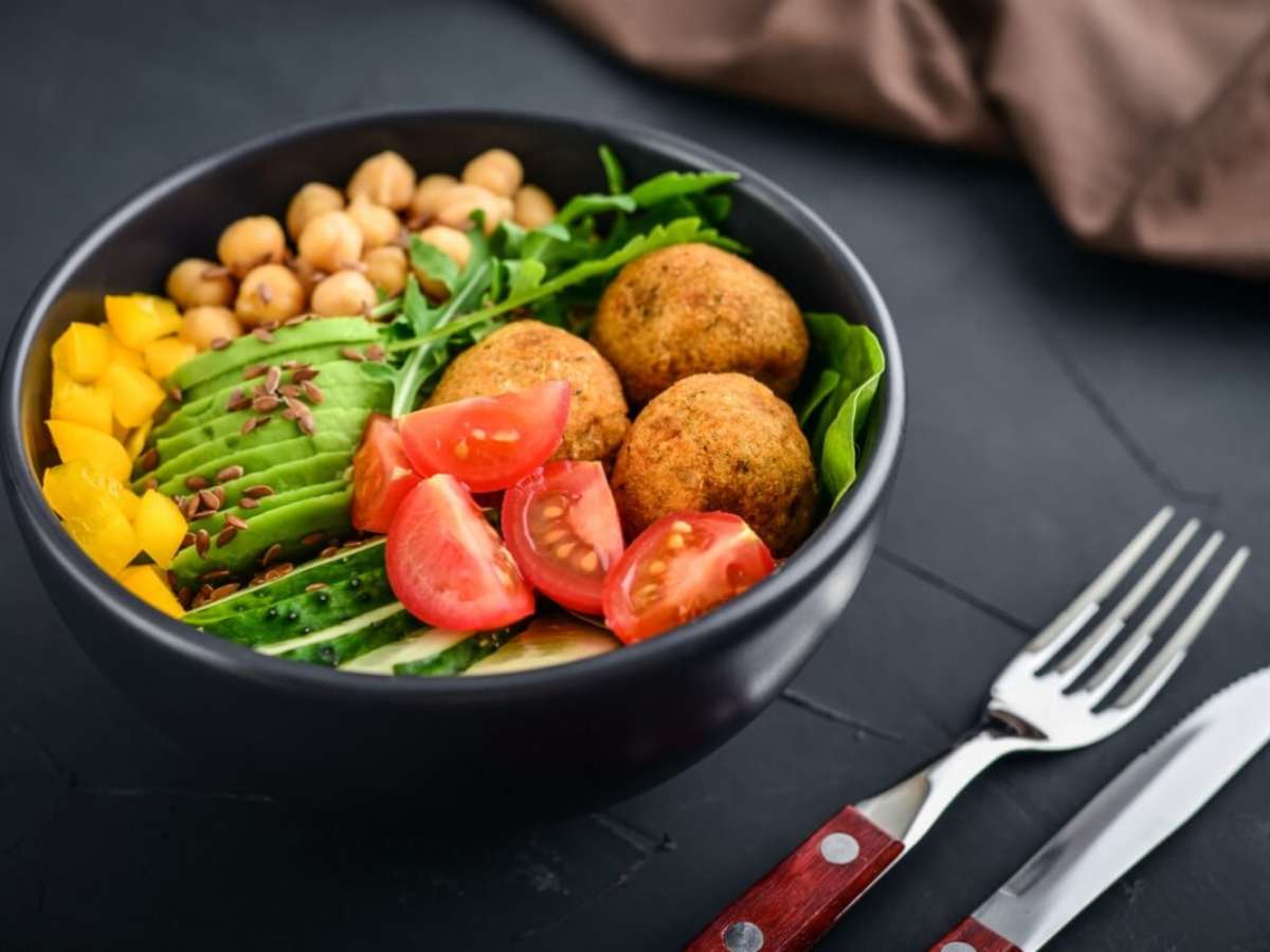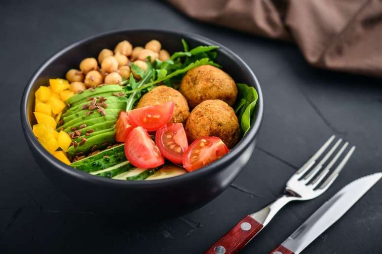 1. Bowl com falafel, grão-de-bico e vegetais