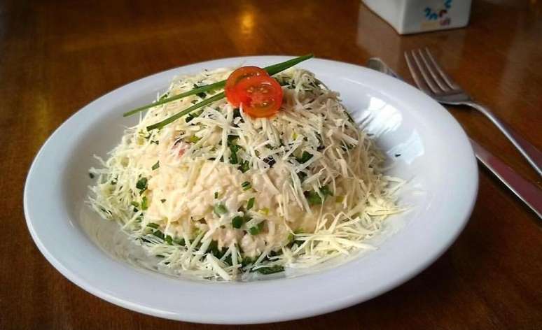 - Desligue o fogo, misture o creme de leite, o queijo ralado, o requeijão e a salsinha. Sirva quente.
