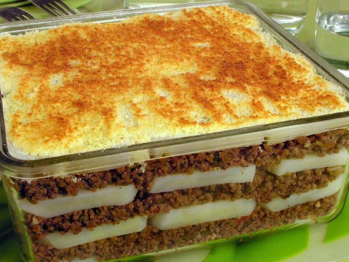- Em um refratário médio, intercale camadas de batata e de carne, terminando em batata.